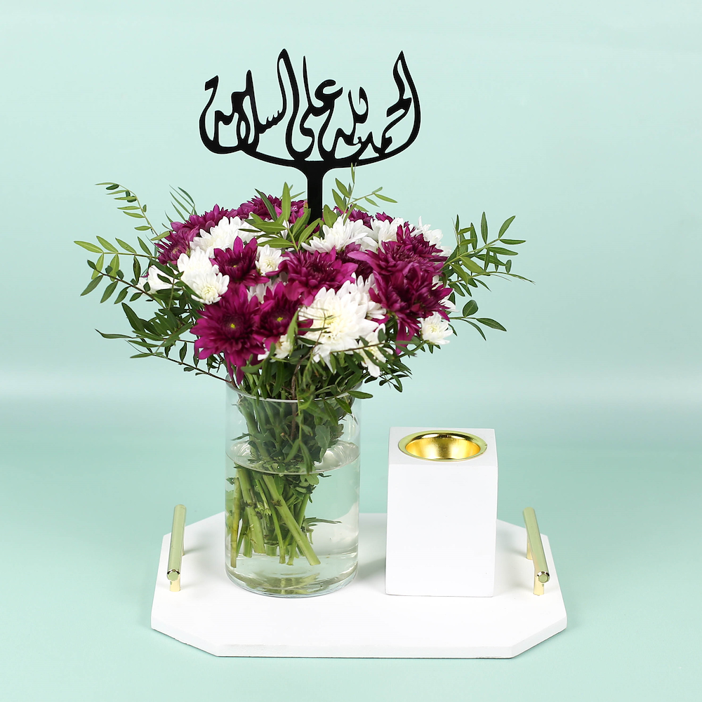 A bouquet containing chrysanthemum flowers with an incense burner, arranged beautifully in a tray.