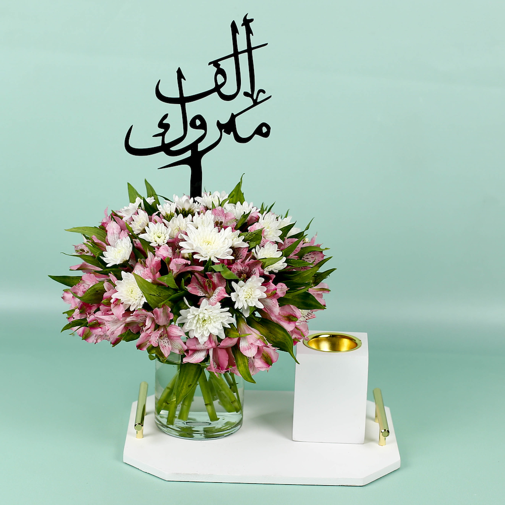 This bouquet contains alstroemeria and chrysanthemum flowers with a mubkhar.