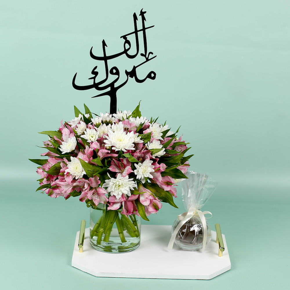 This bouquet contains alstroemeria and chrysanthemum flowers with chocolate.