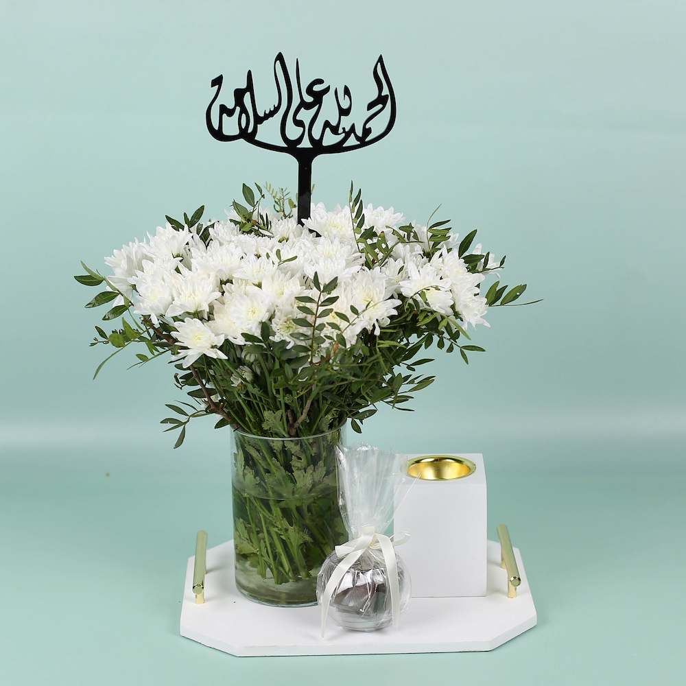This bouquet contains chrysanthemum flowers with chocolates and a mubkhar.