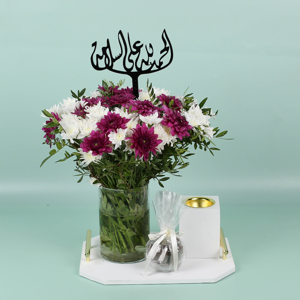 This bouquet contains chrysanthemum flowers with chocolates and a mubkhar.