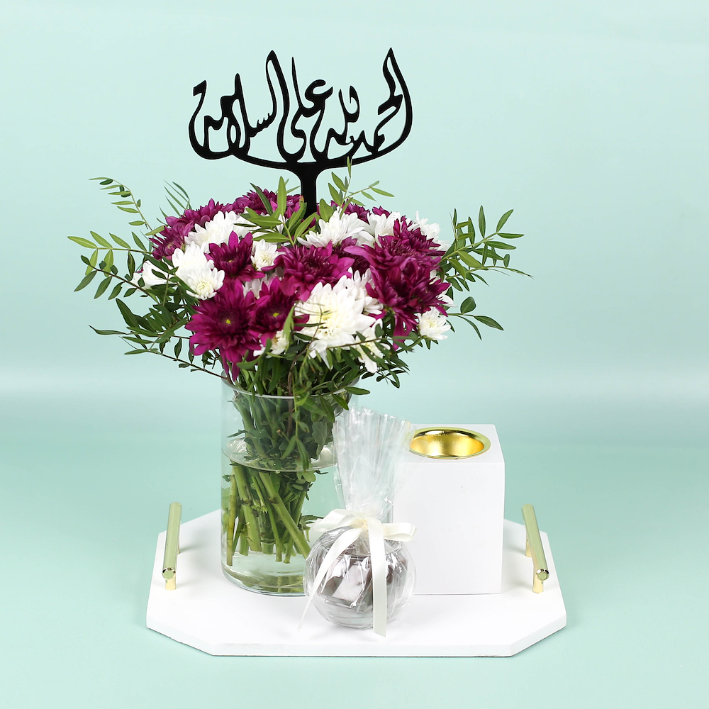 A bouquet containing chrysanthemum flowers with chocolates and an incense burner, arranged beautifully in a tray.