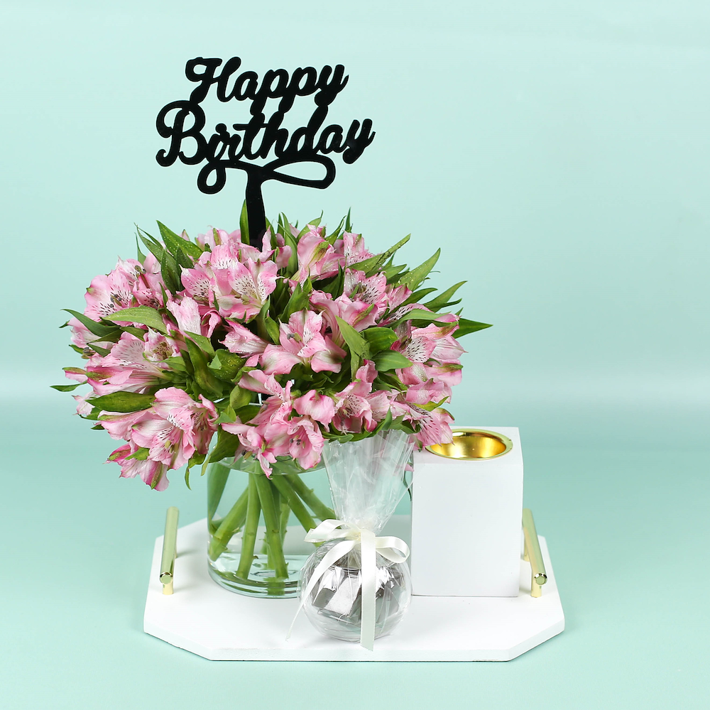 A bouquet containing alstroemeria flowers with chocolates and an incense burner, arranged beautifully in a tray.