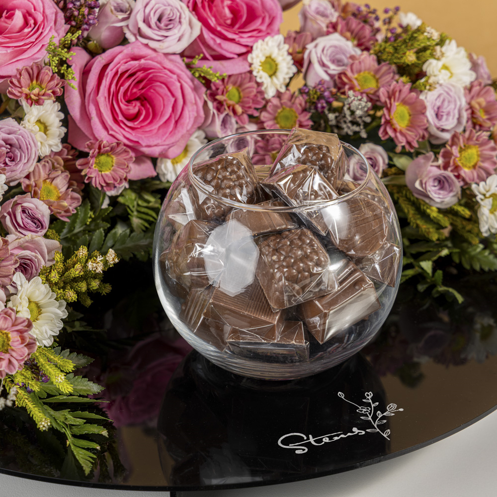 A black tray that contains roses, protea, baby roses along with Belgian chocolates.