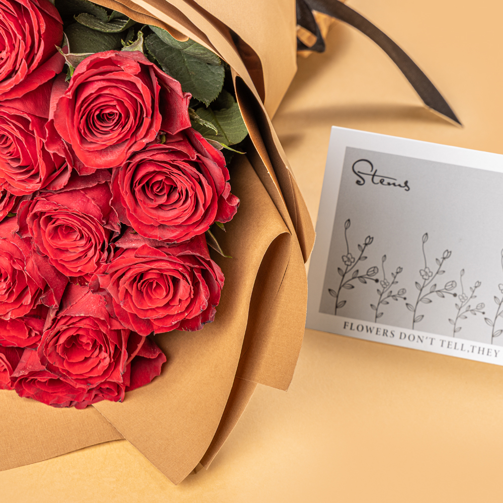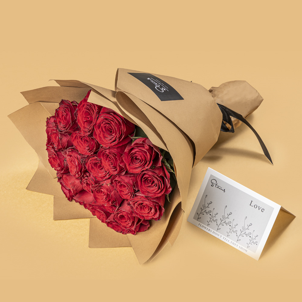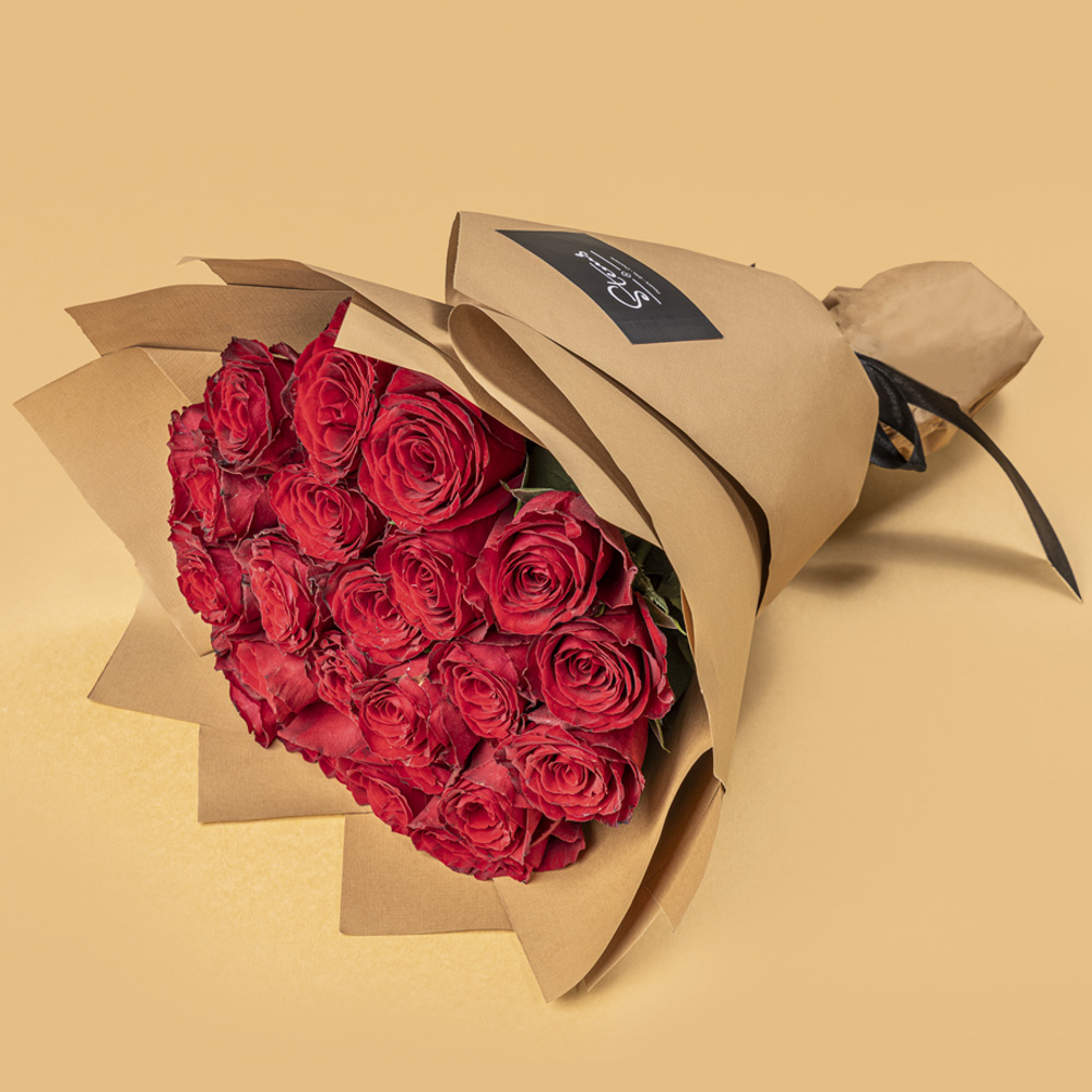 A hand bouquet filled by 25 red roses with a special wrapping.