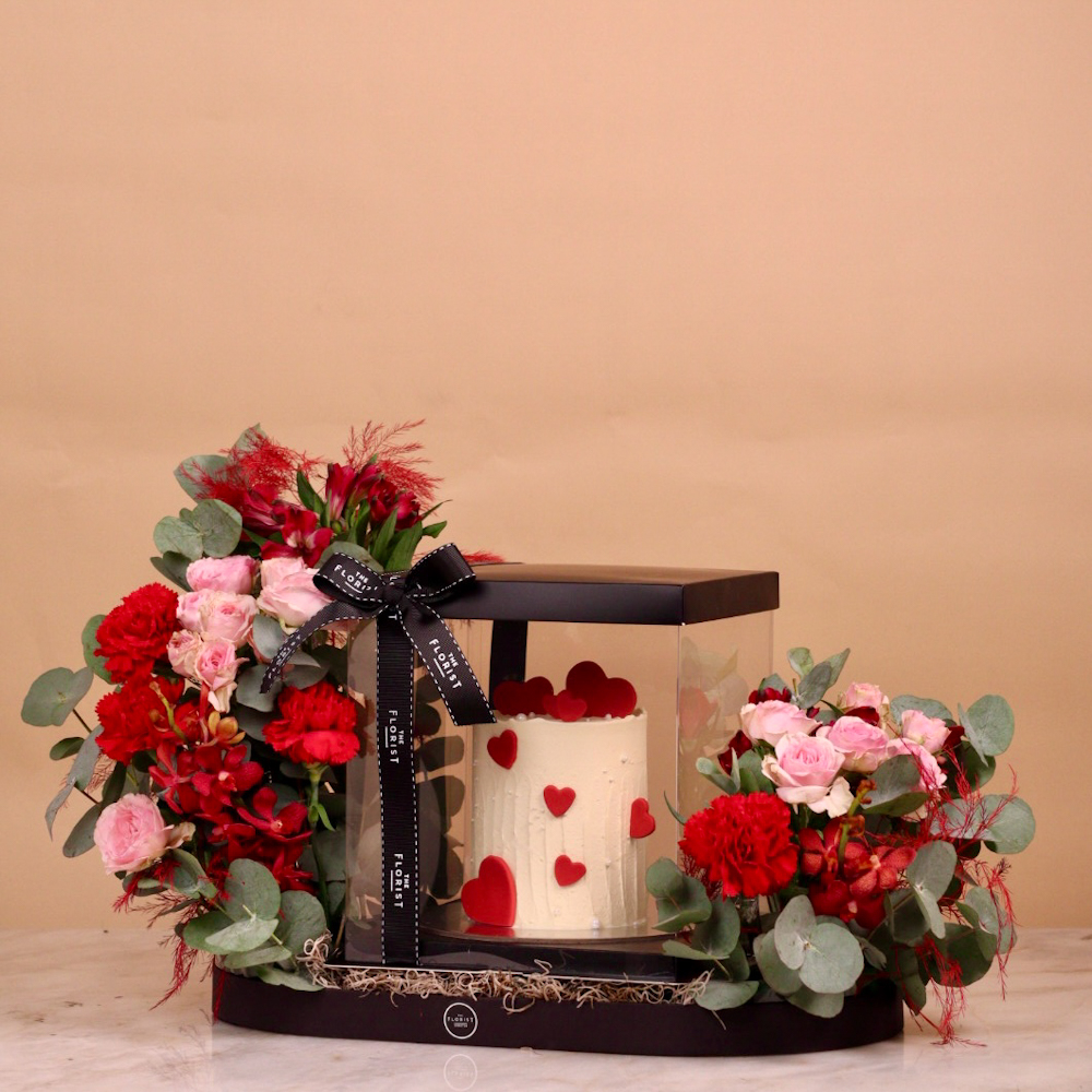 A hand bouquet of red baby roses with delicious chocolates.