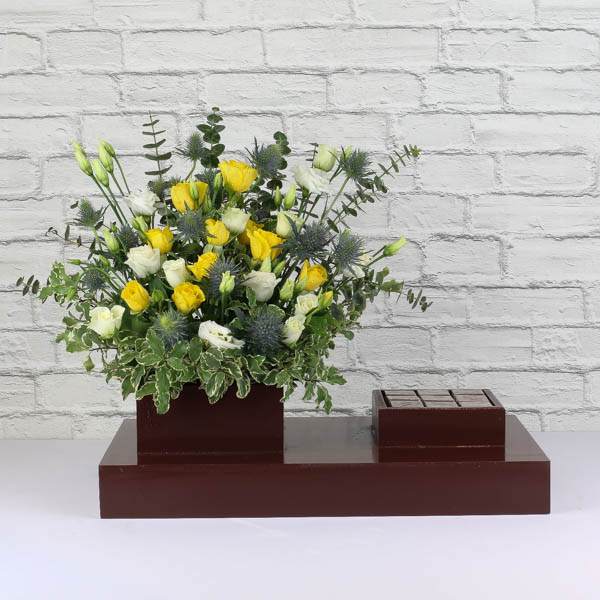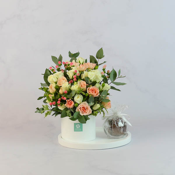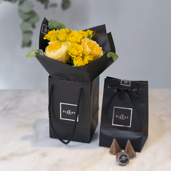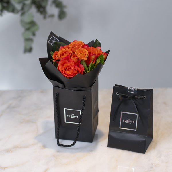 A mini bouquet containing orange flowers with a bag of chocolate.