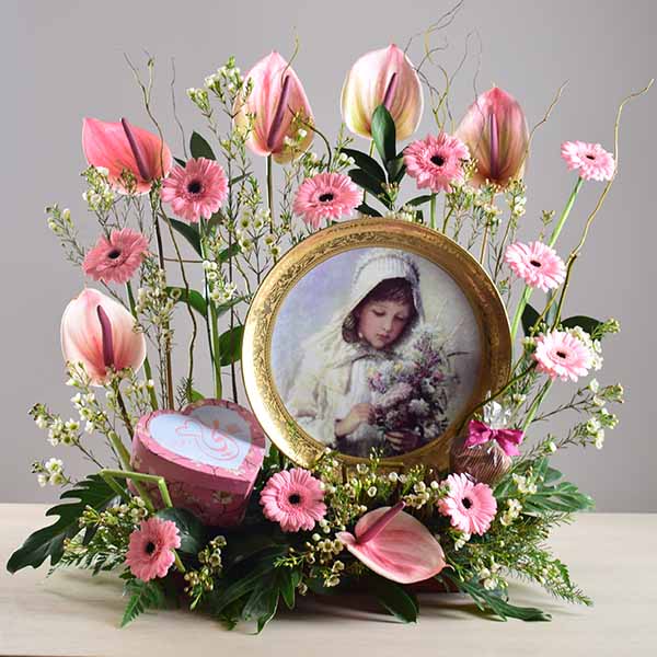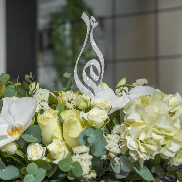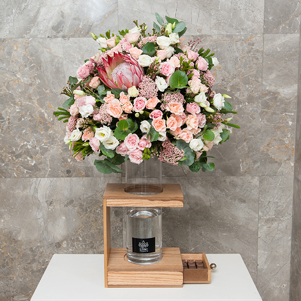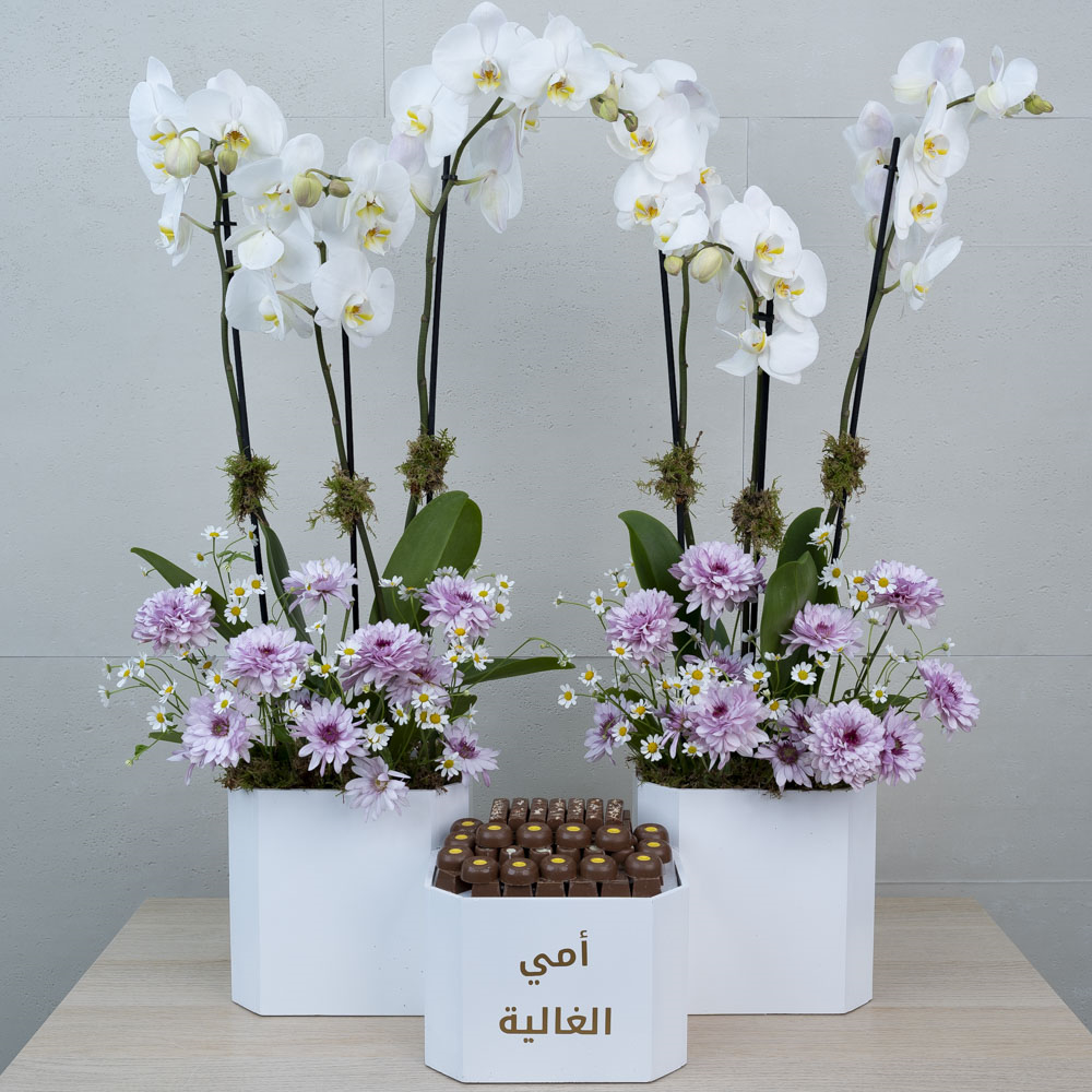A large box filled with white hydrangea and roses flowers with chocolates with mother sign.