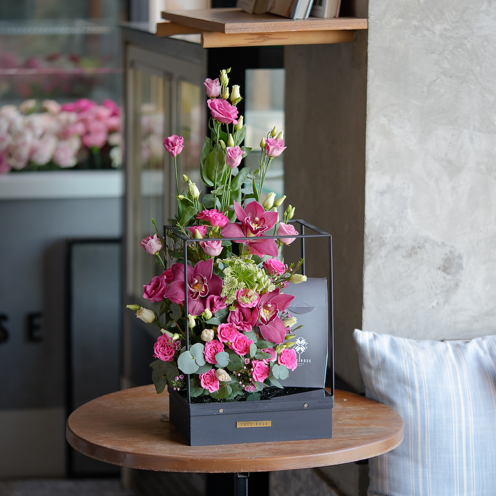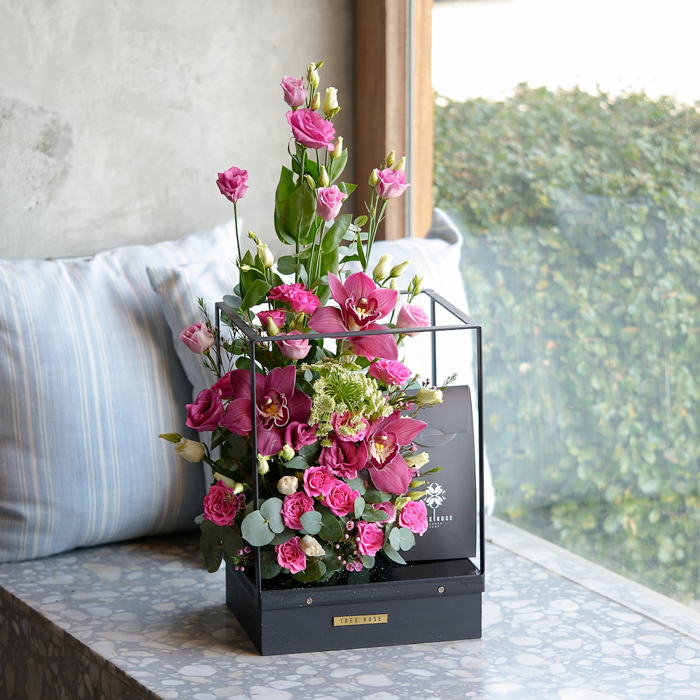 A bouquet that contains pink baby roses and orchids in a stand with 10 pieces of chocolate.