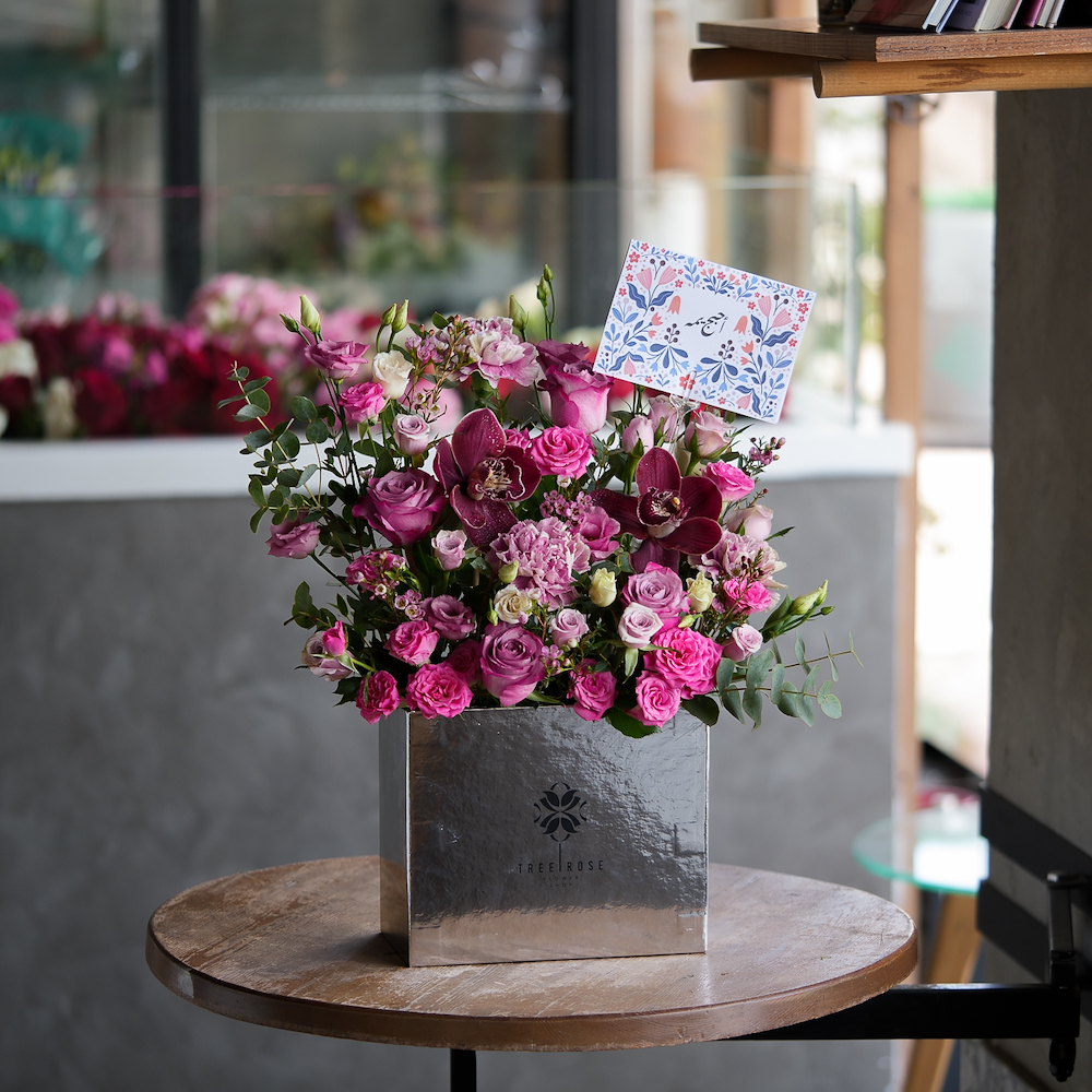 A vibrant mix of pink roses, carnations, and deep burgundy orchids, presented in a silver box.