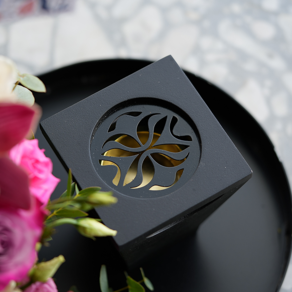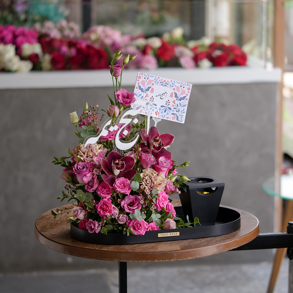 Mix of roses and orchids paired with a Mubkhar, arranged on a black Tray.