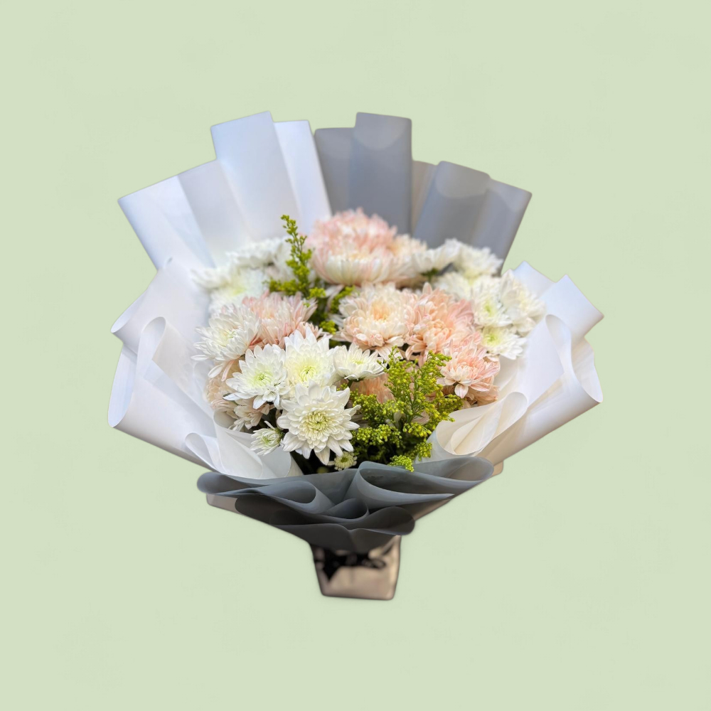 An elegant hand bouquet arranged with chrysanthemum and solidago flowers, in an elegant wrapping design.