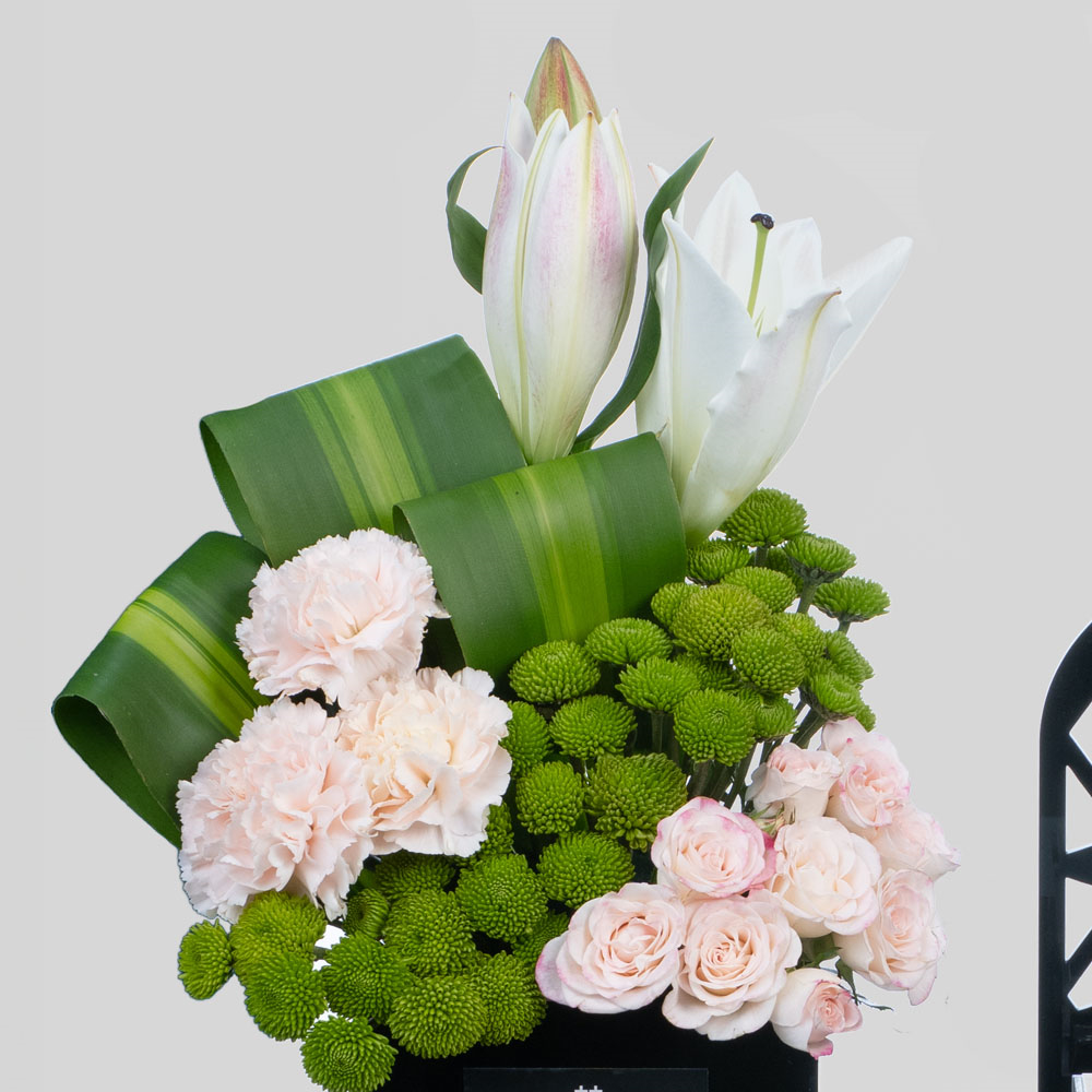 A bouquet containing baby roses, lilies, chrysanthemums, and carnations, arranged beautifully in an acrylic tray. Comes with chocolates in kunafa pistachio, saffron cheesecake, and hazelnut cream fillings.