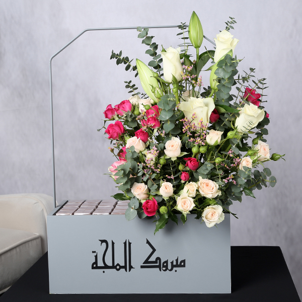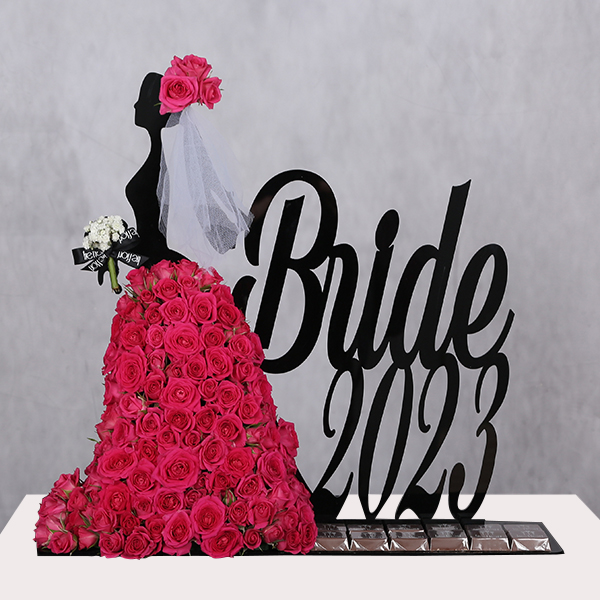 Acrylic bride design with baby roses flowers and chocolates.