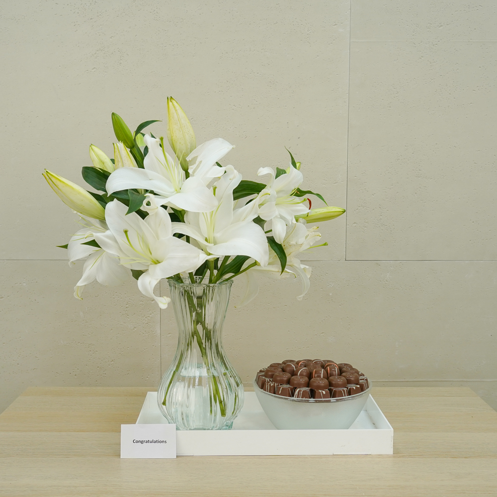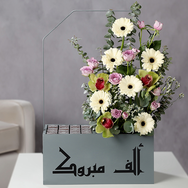This bouquet contains baby roses and orchids in a wooden box with chocolates.