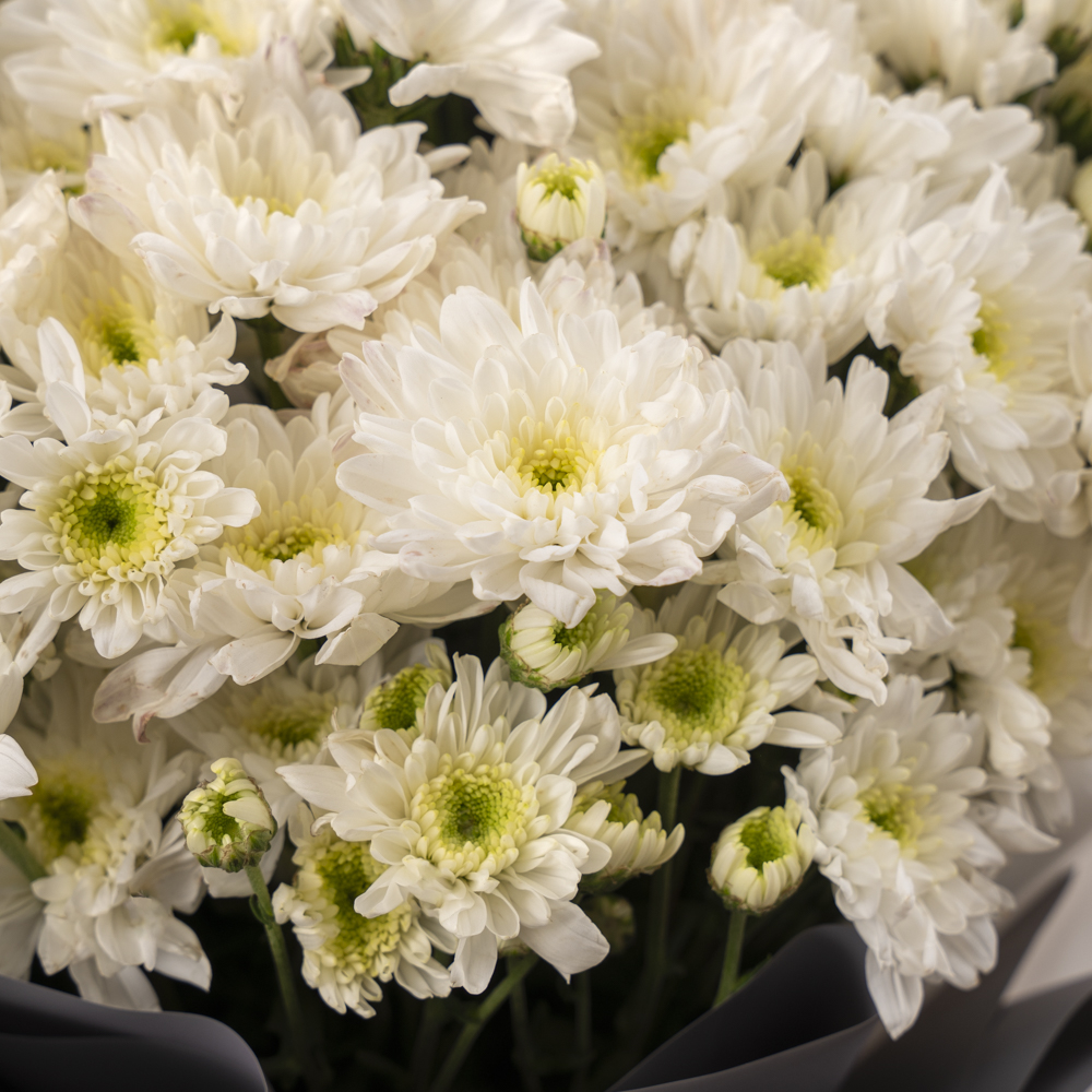 An elegant hand bouquet arranged with chrysanthemum flowers, in an elegant wrapping design.