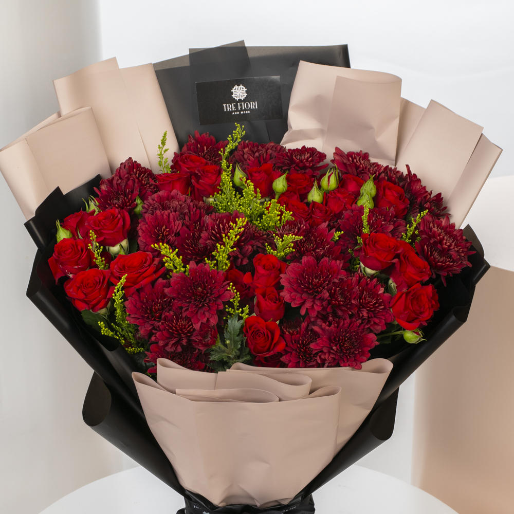 A hand bouquet arranged with roses, baby roses, and chrysanthemums in an elegant wrapping design.