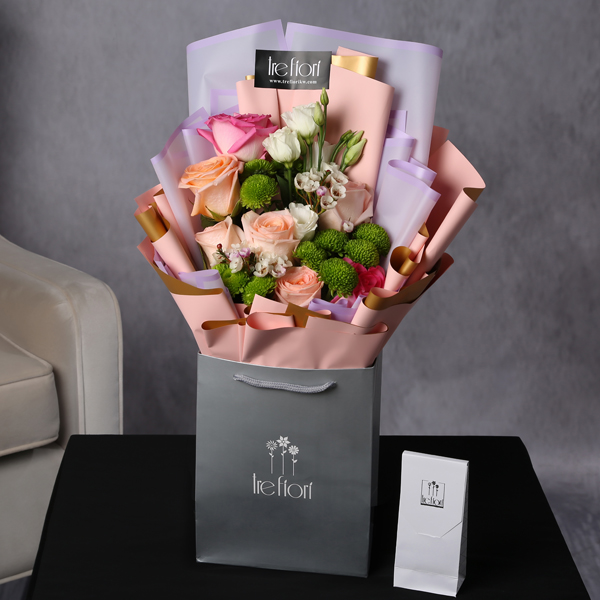A hand bouquet arranged with baby roses and roses flowers and box of chocolates, Note: total size with the bag.