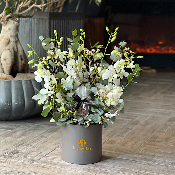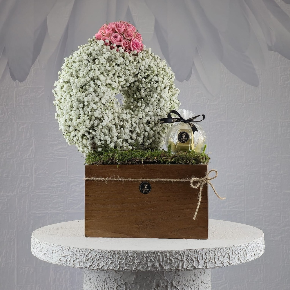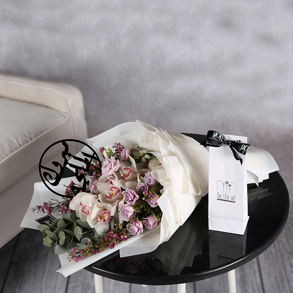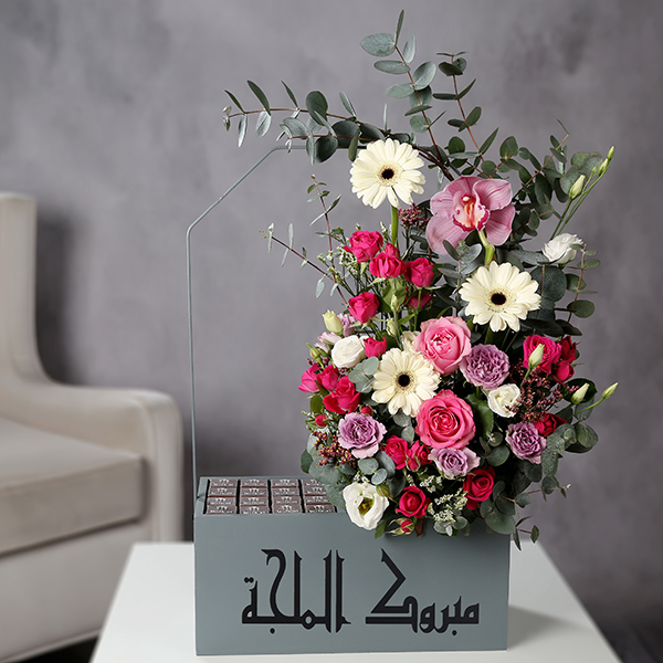 A hand bouquet with mix of roses and box of chocolate's and acrylic sign.