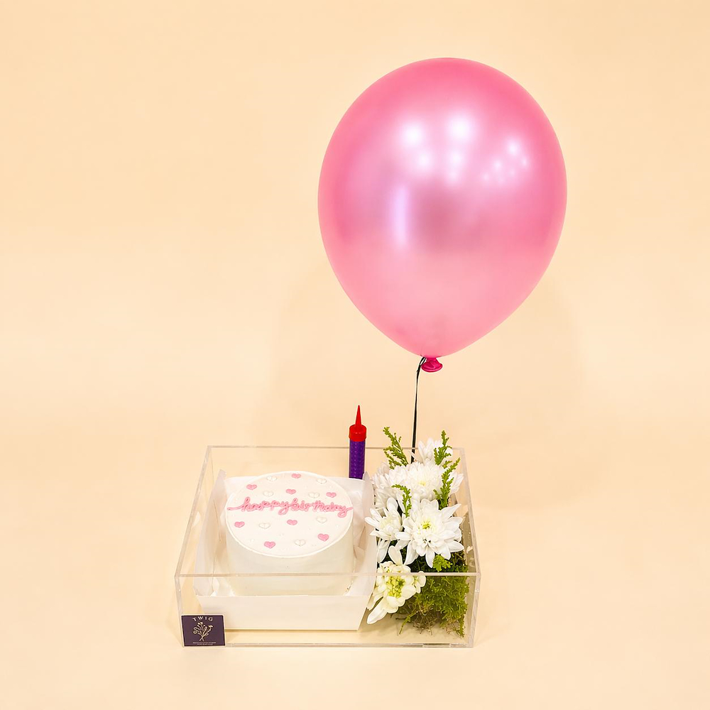 A bouquet containing white roses, arranged beautifully in an acrylic box. Comes with a cake and a candle.