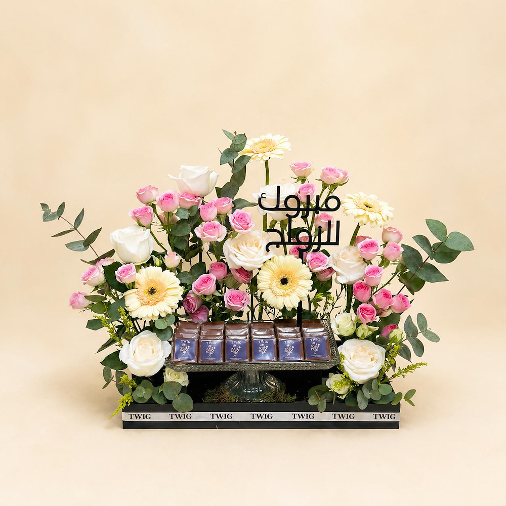 An acrylic tray featuring roses, baby roses and gerberas with 20 pieces of chocolate.