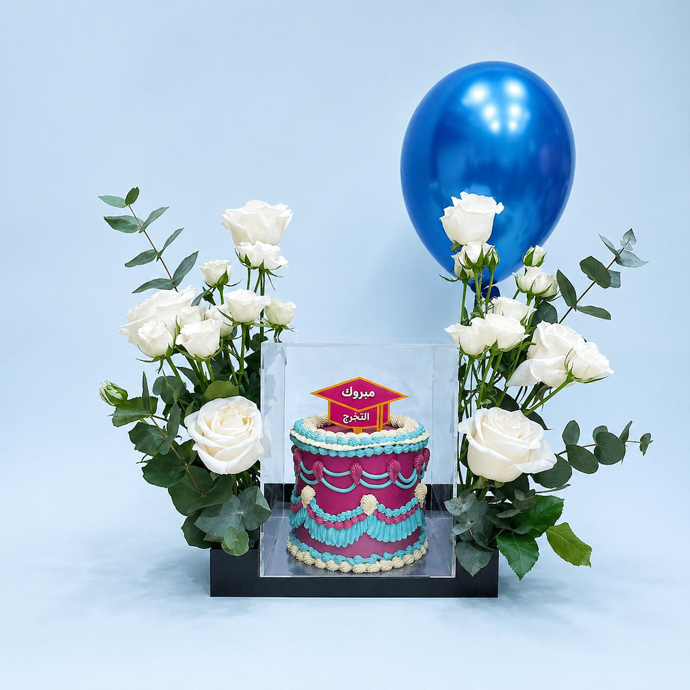 An acrylic tray featuring roses and baby roses with a cake serves 3 to 6 people.