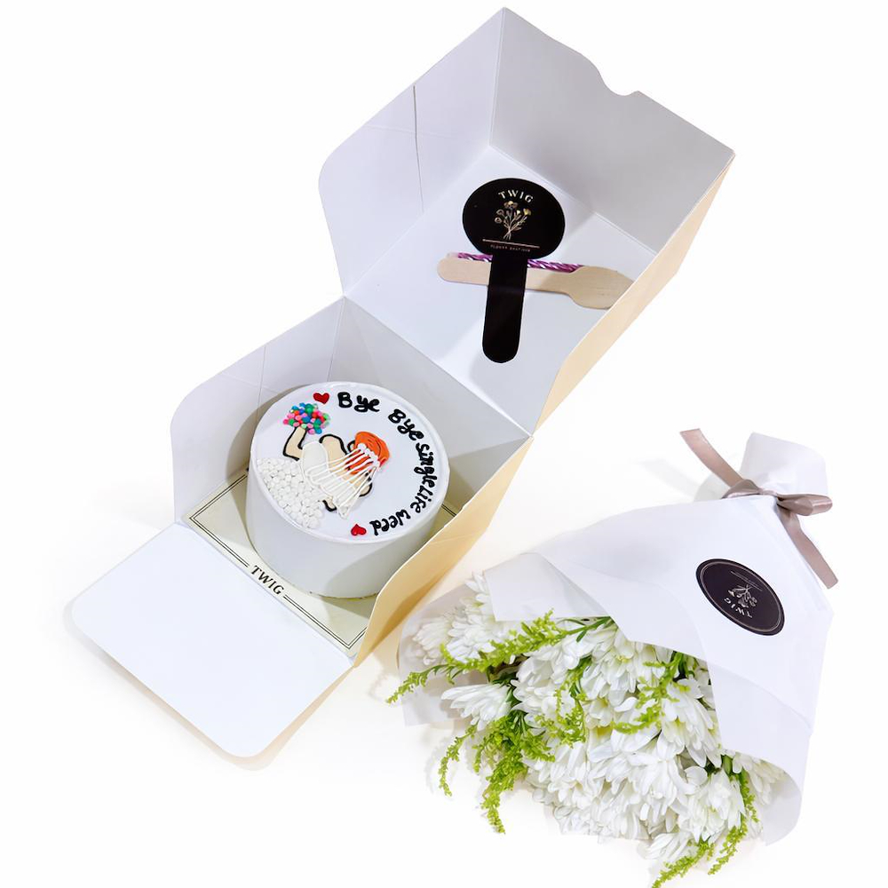A hand bouquet containing white chrysanthemum flowers, comes with a bento cake, 2 balloons, and party poppers.