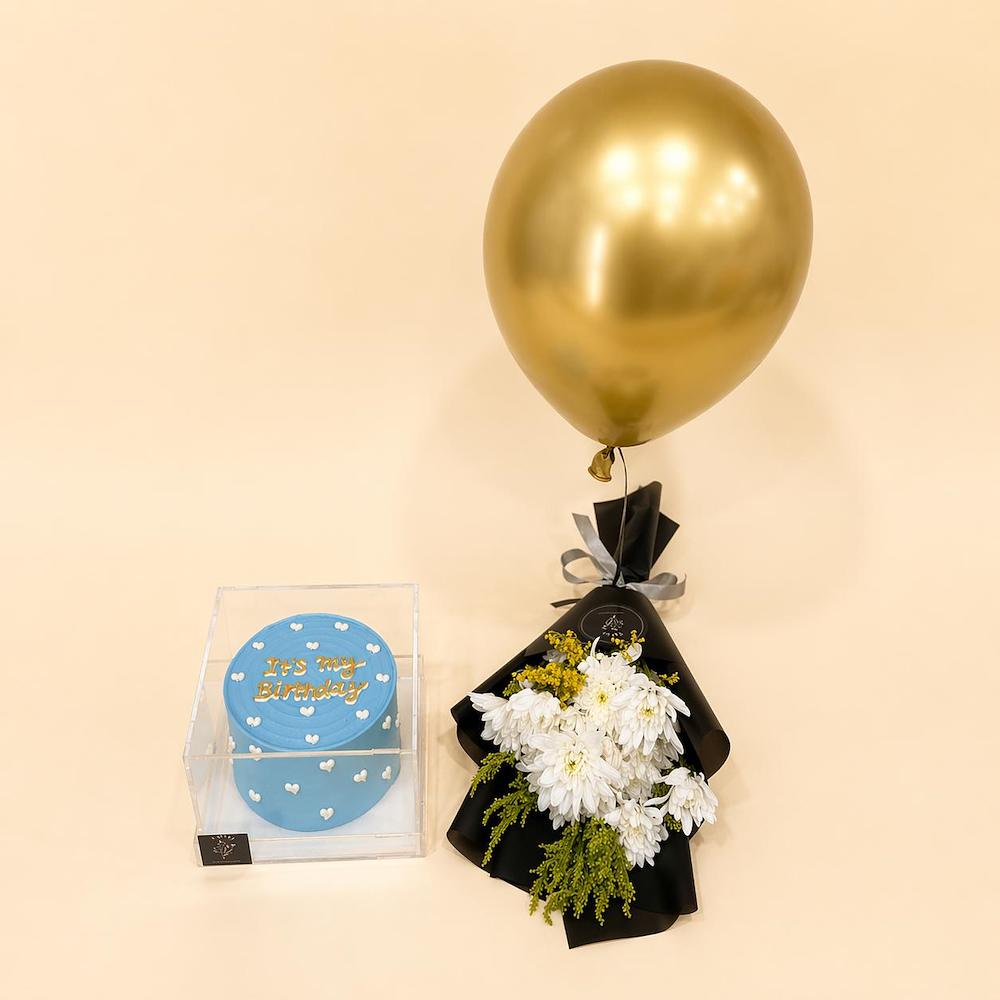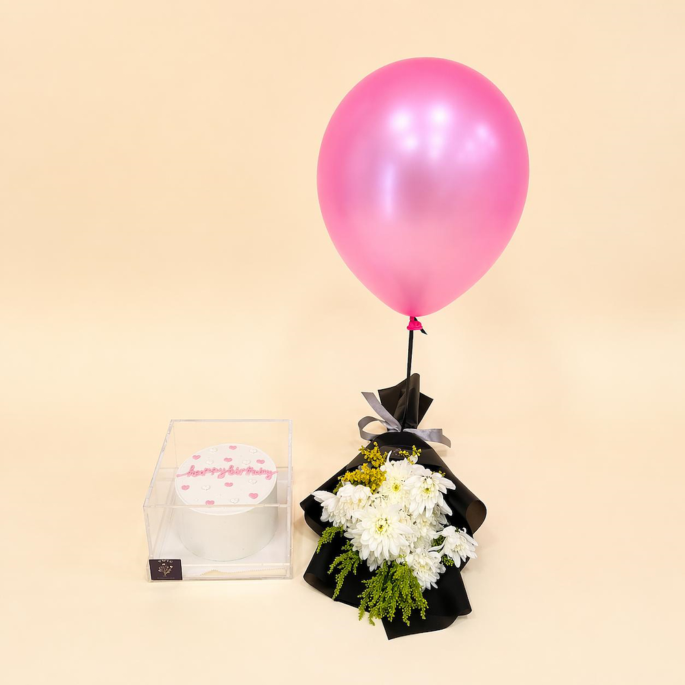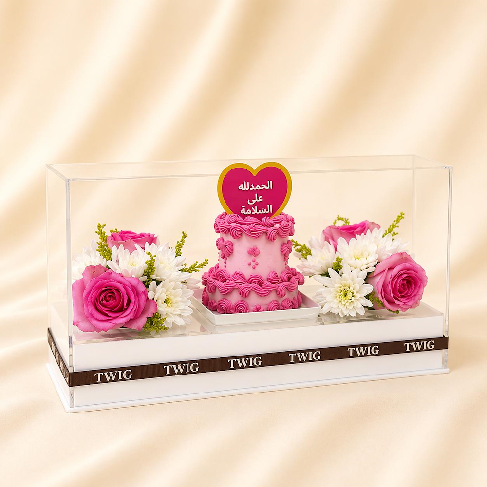 An acrylic box that contains roses and chrysanthemums, along with a cake and a birthday topper.