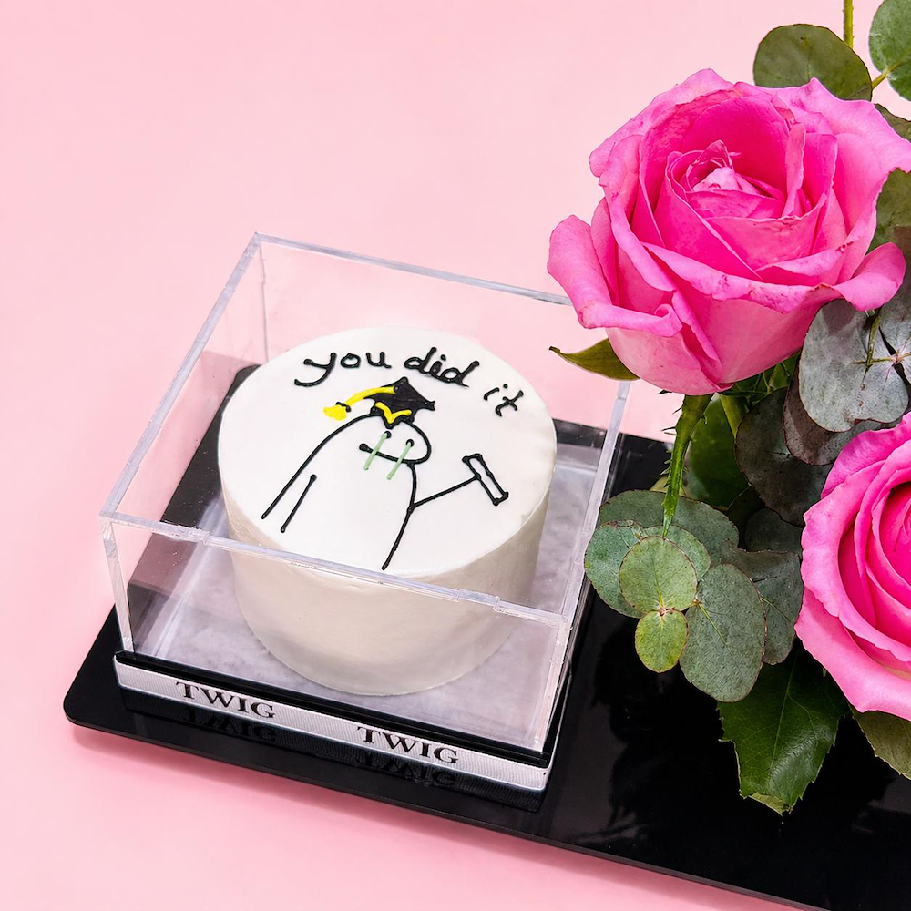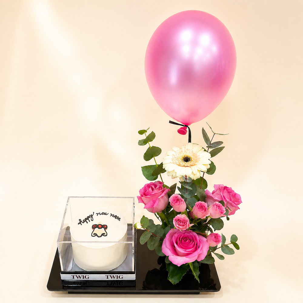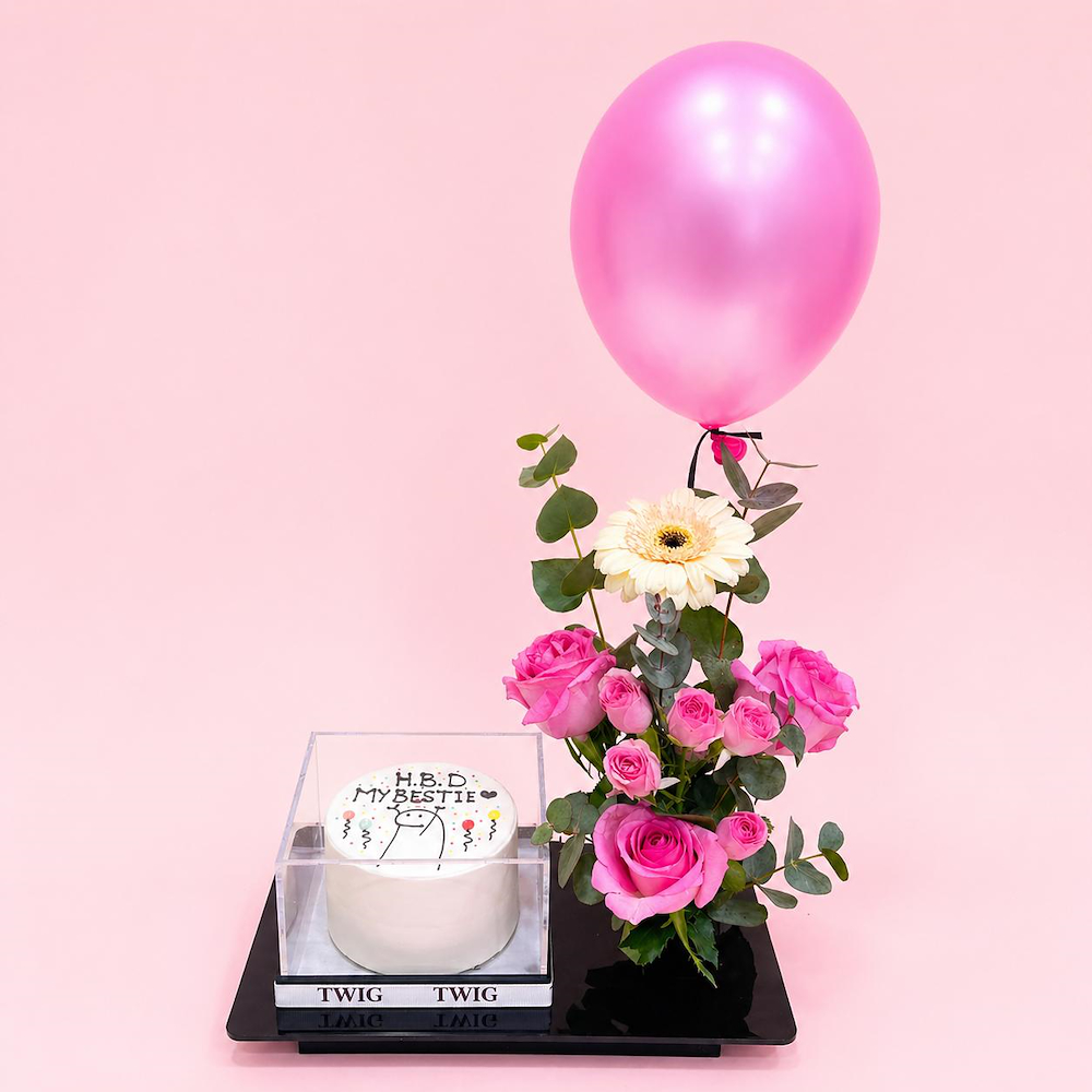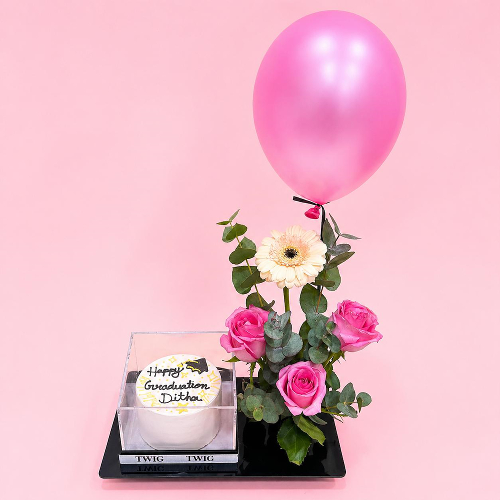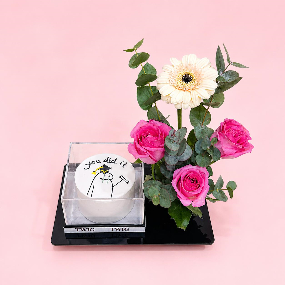 An acrylic base featuring roses and a gerbera with a cake.