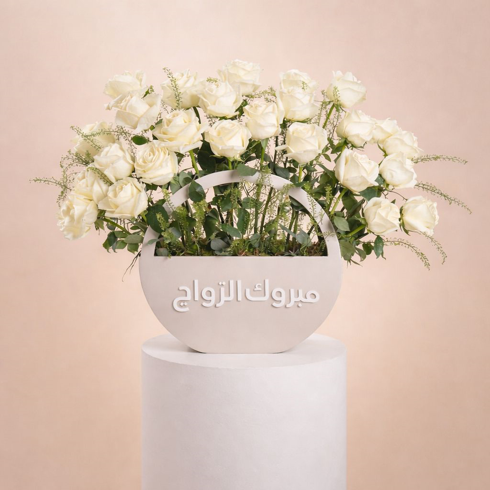 A hand bouquet filled roses, chrysanthemum and alstroemeria flowers with a graduation cake.