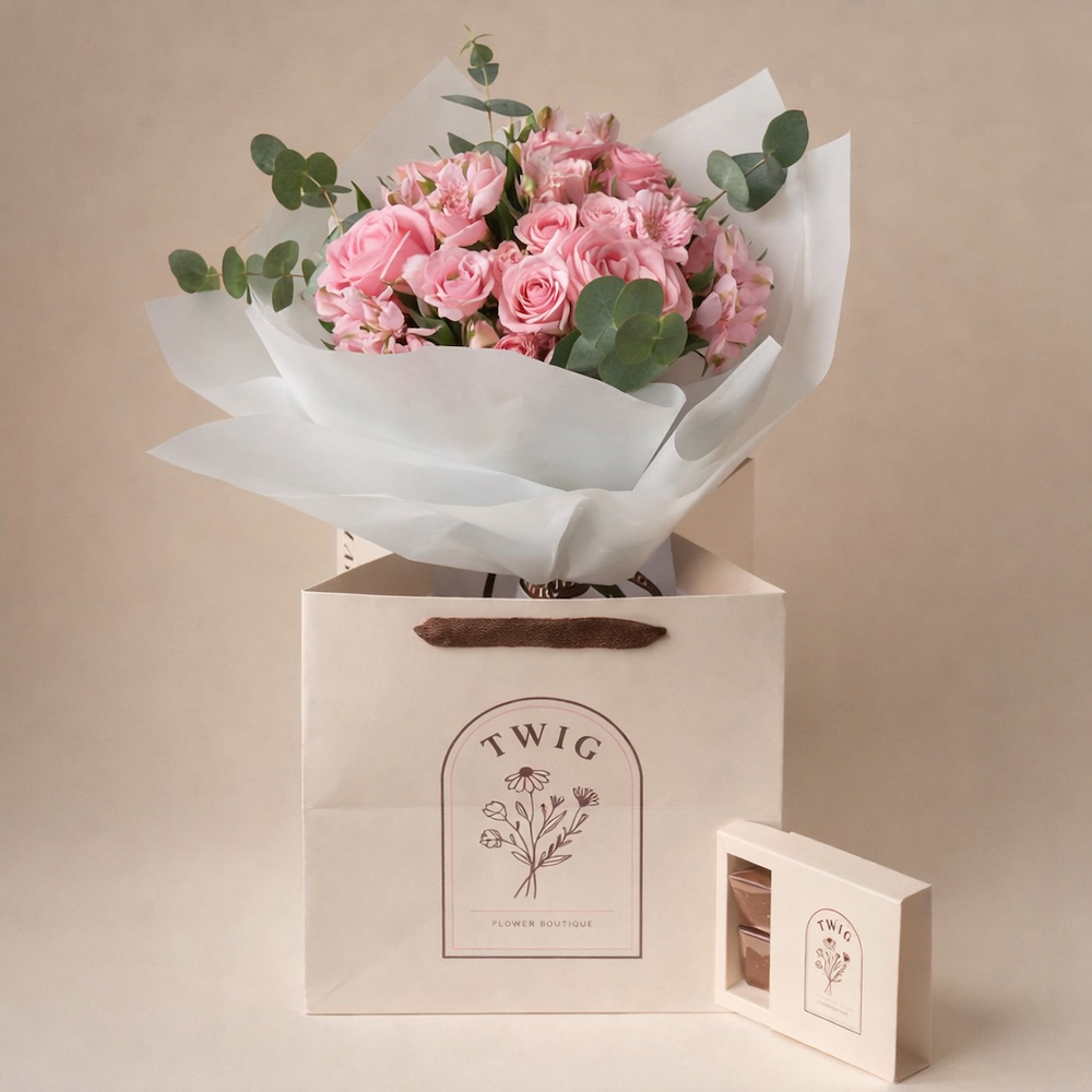 A hand bouquet of pink roses paired with a delicious chocolate box. A sweet and elegant gift, perfect for expressing love and appreciation.
