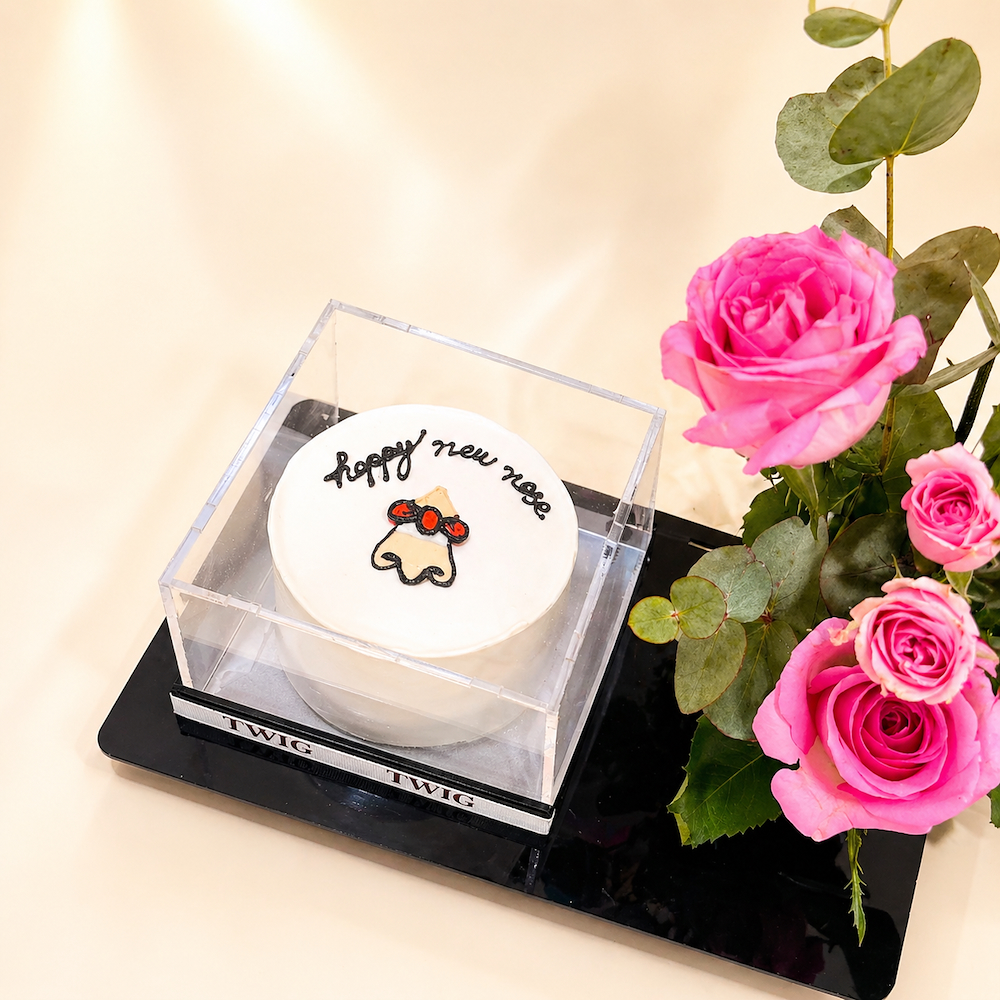 An acrylic base featuring roses, baby roses and a gerbera with a cake and a balloon.