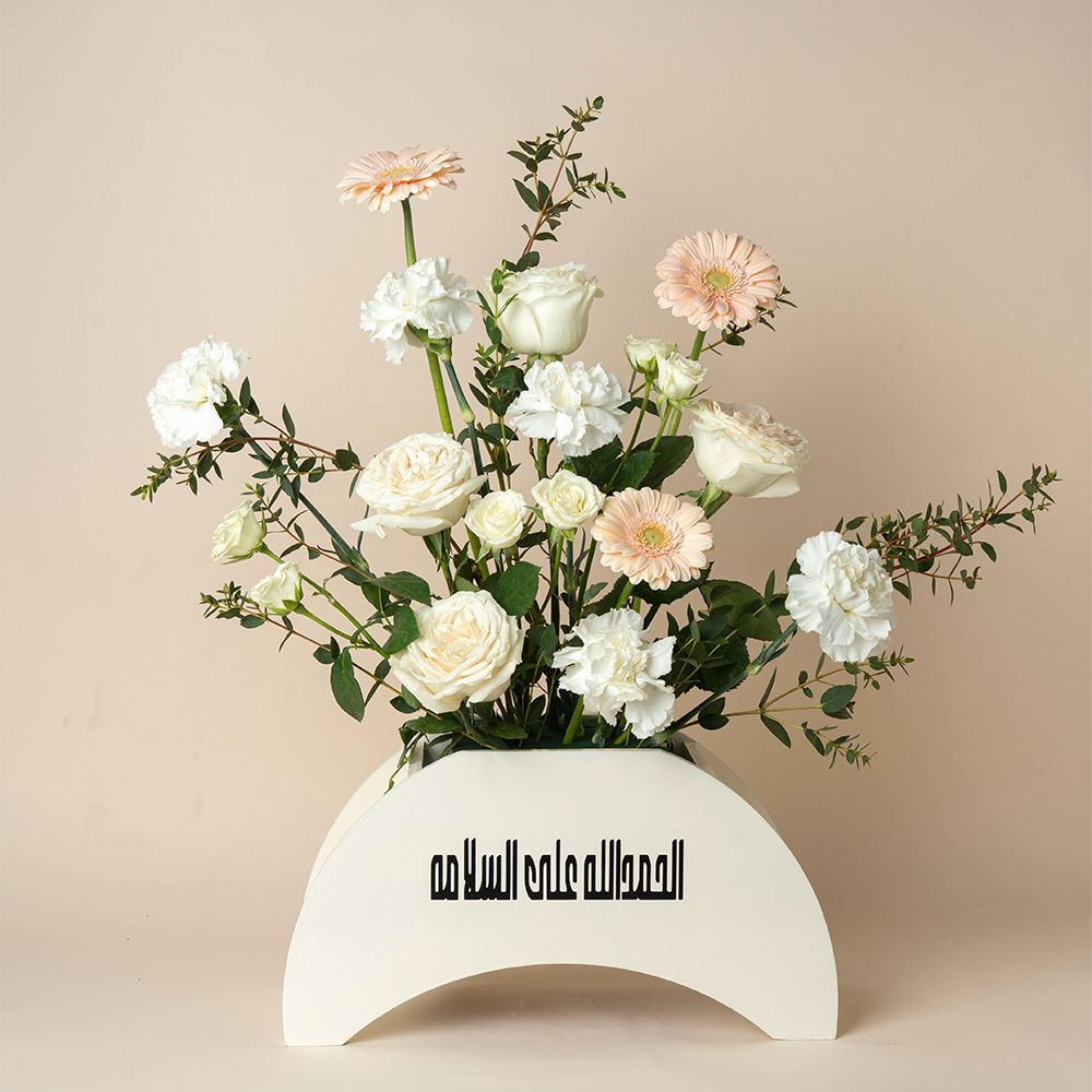 A bouquet containing roses, baby roses, gerberas, and carnations, arranged beautifully in a stand.