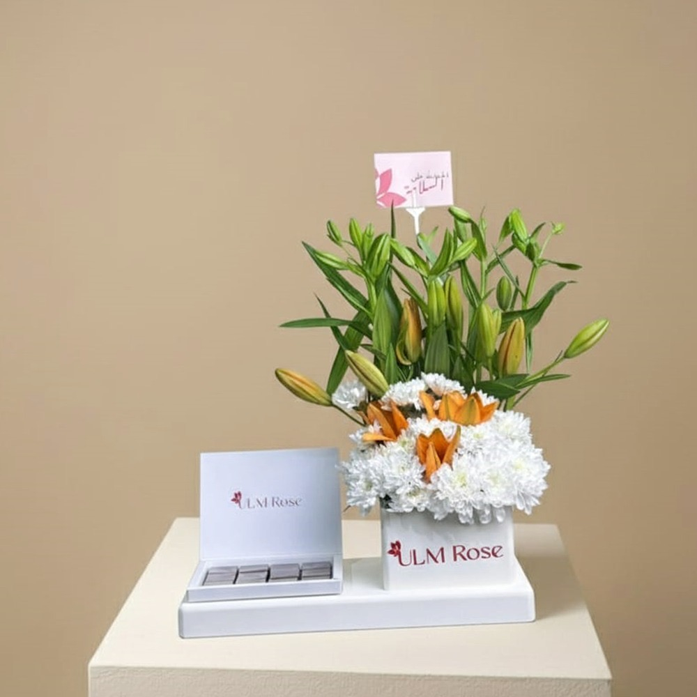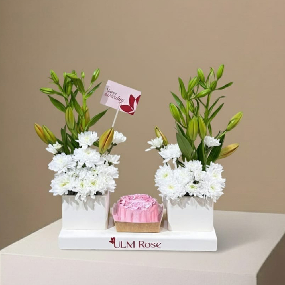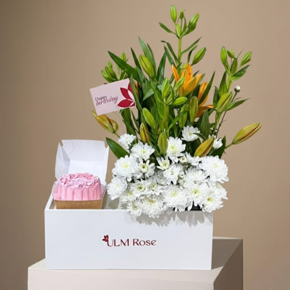 This bouquet contains lime blossoms, chrysanthemums, and Kuwaiti roses, along with a delicious cake.