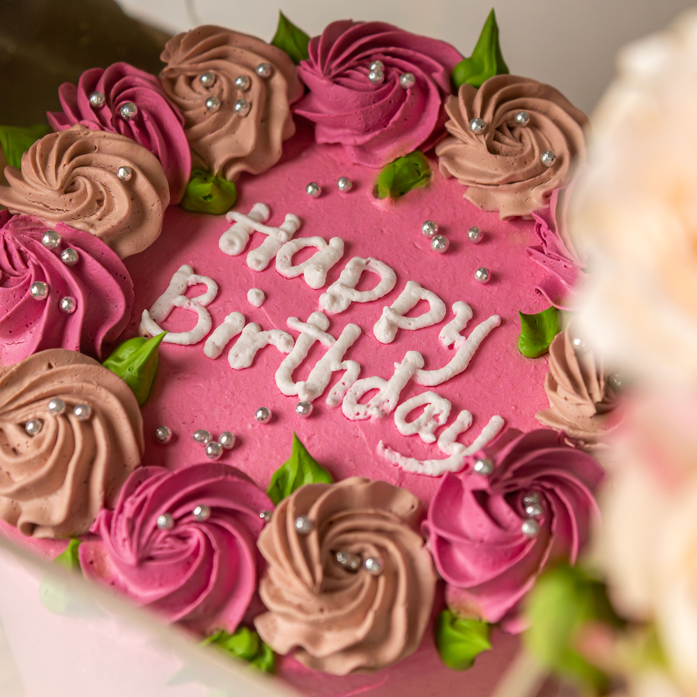 A box beautifully arranged with roses, gerberas, baby roses, and cymbidiums with a delicious cake.