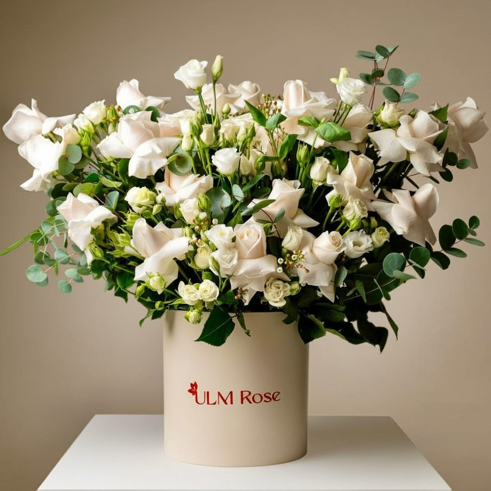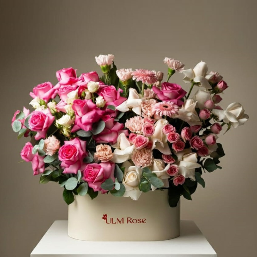 A luxurious box filled with roses, baby roses, gerberas and carnations.