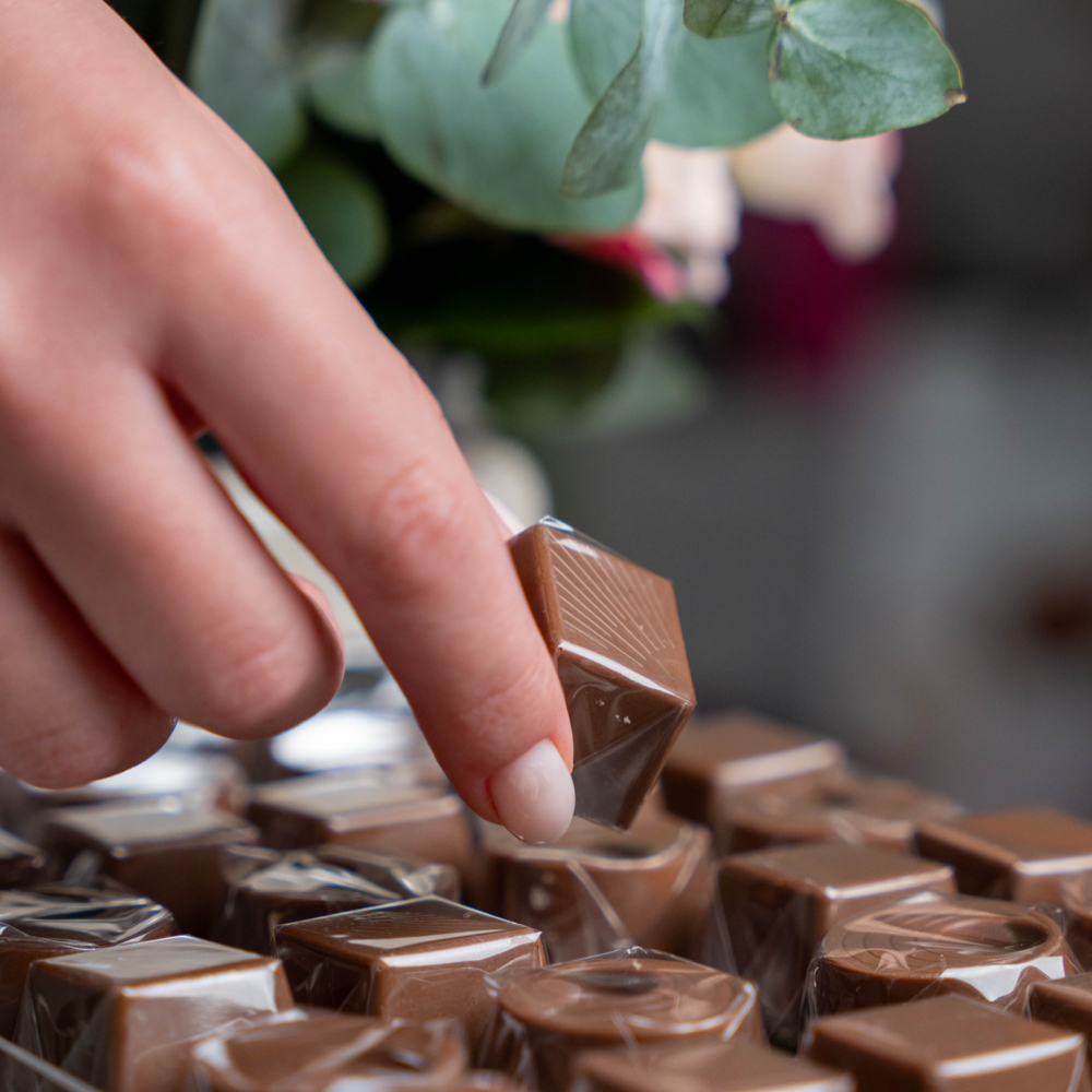 A box arranged with roses, gerberas, baby roses, and cymbidium flowers with Belgian chocolates.