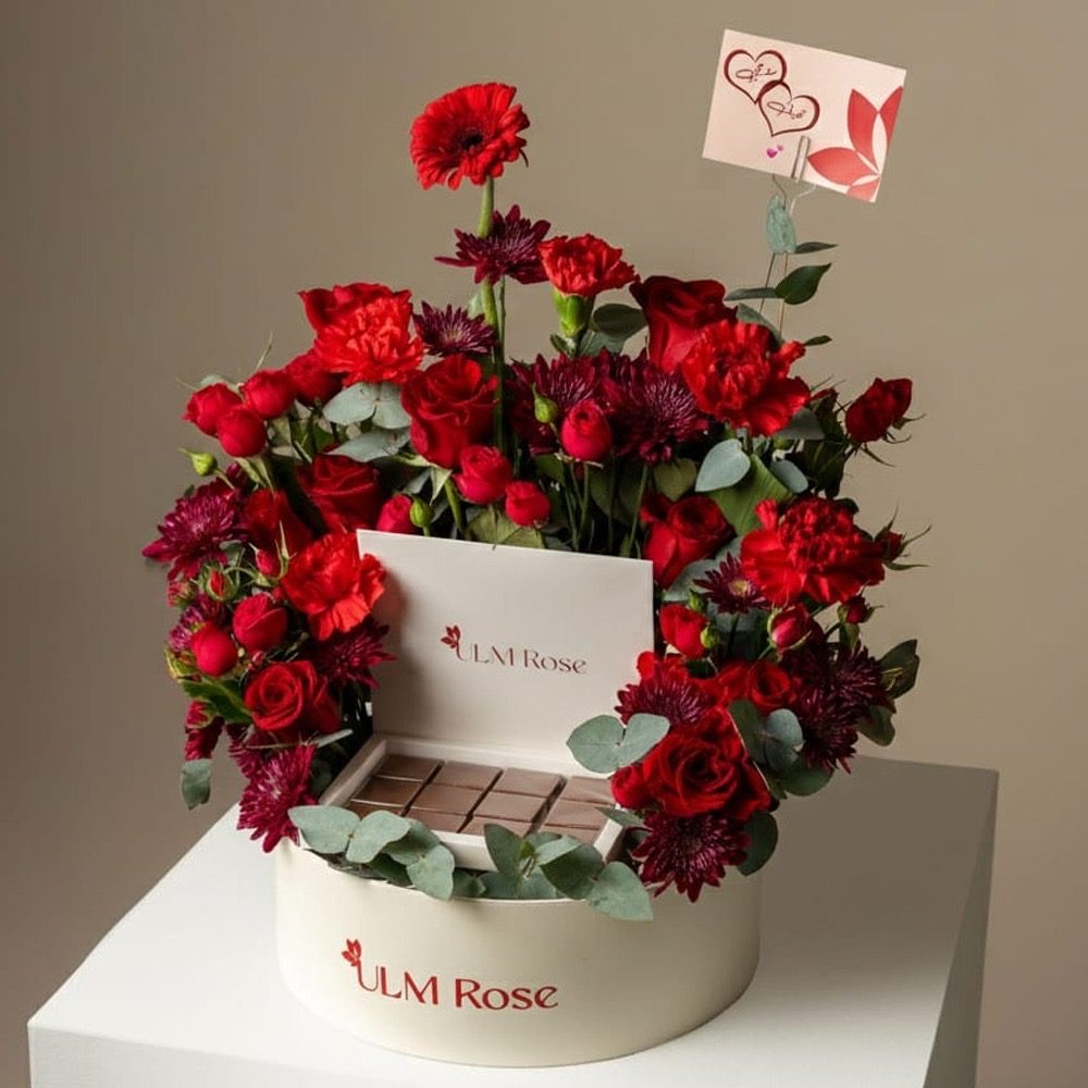 This special bouquet contains roses, baby roses, gerberas, carnations, and chrysanthemums with Belgian chocolates.
