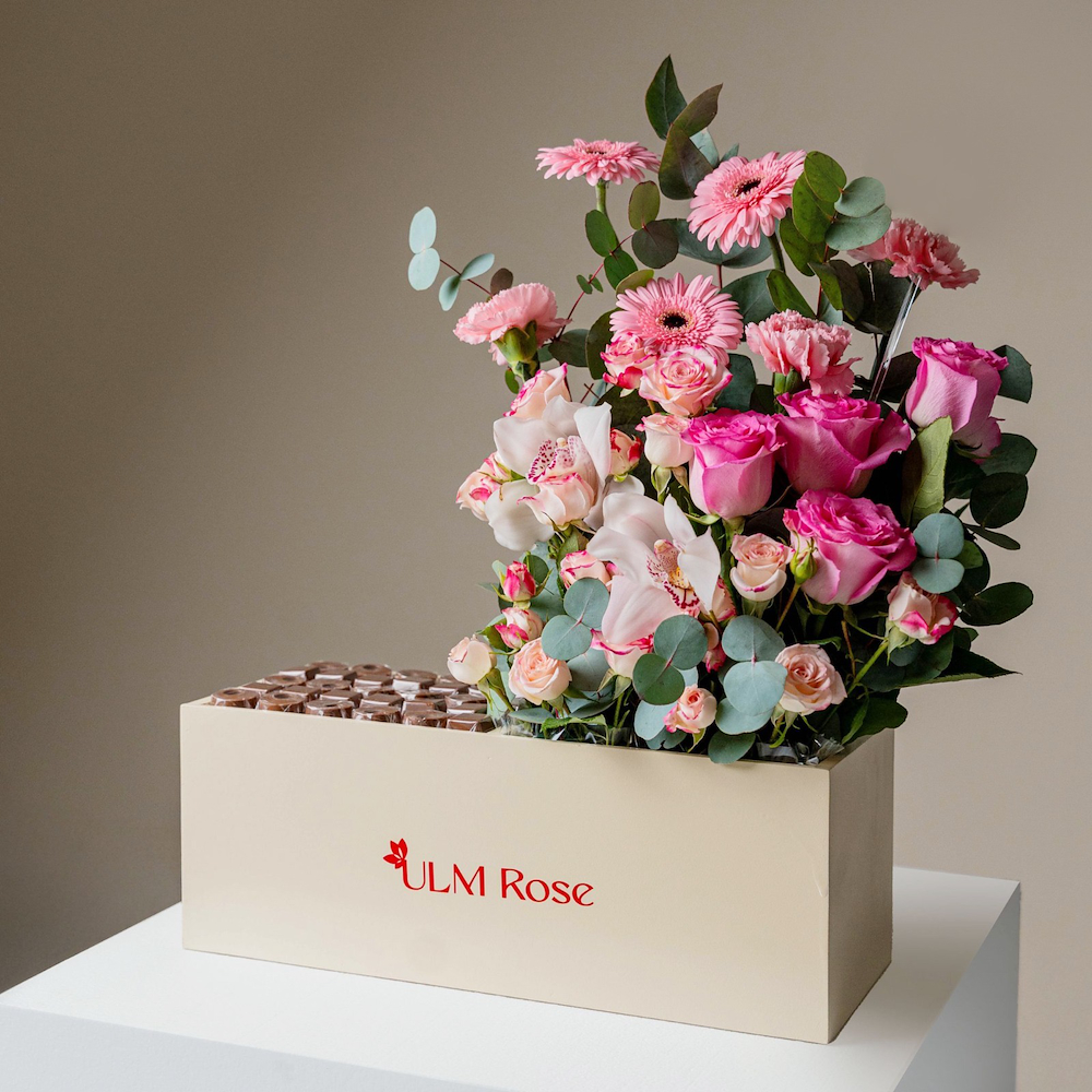 A bouquet containing roses, baby roses, carnations, gerberas, and cymbidiums with Belgian chocolates, beautifully arranged in a box.