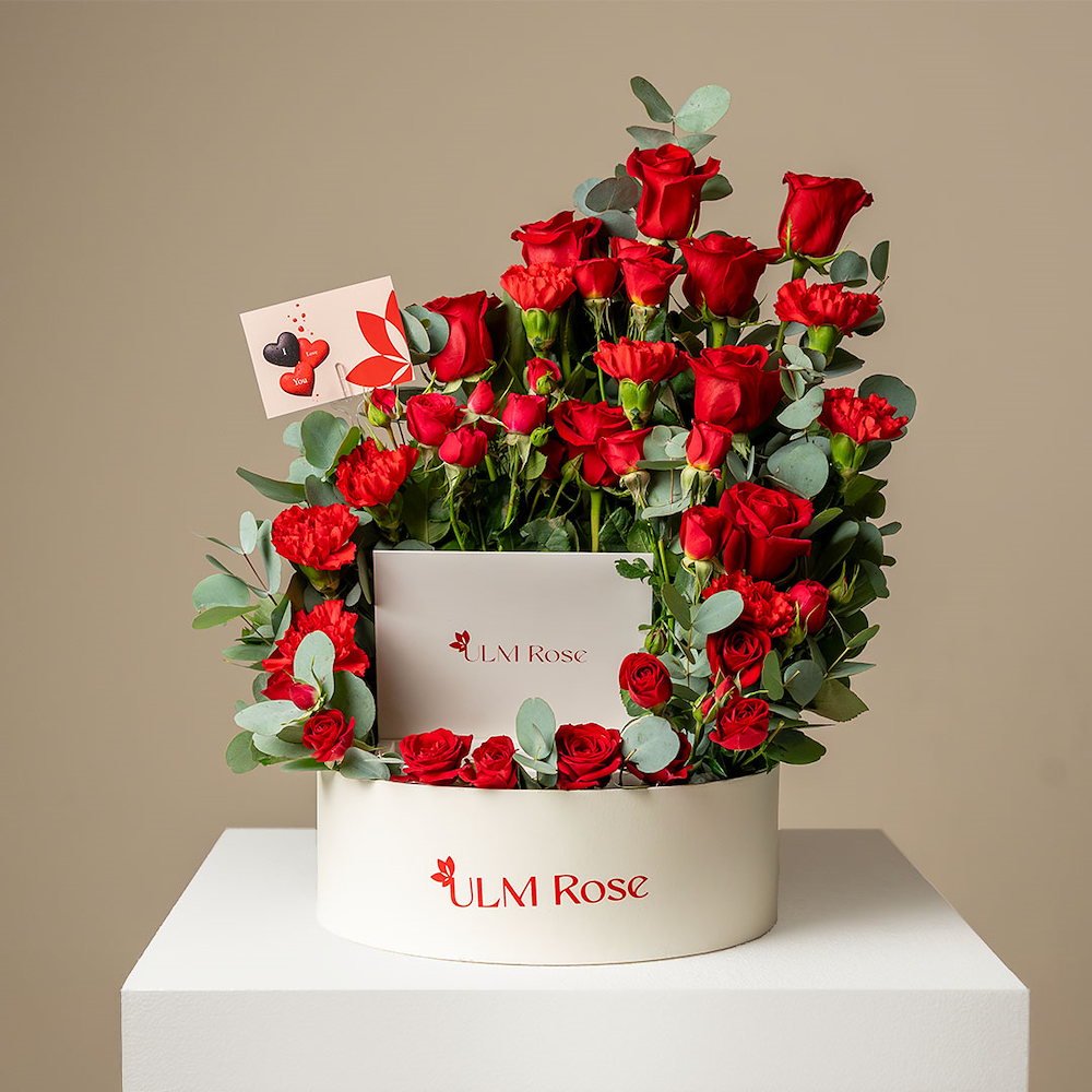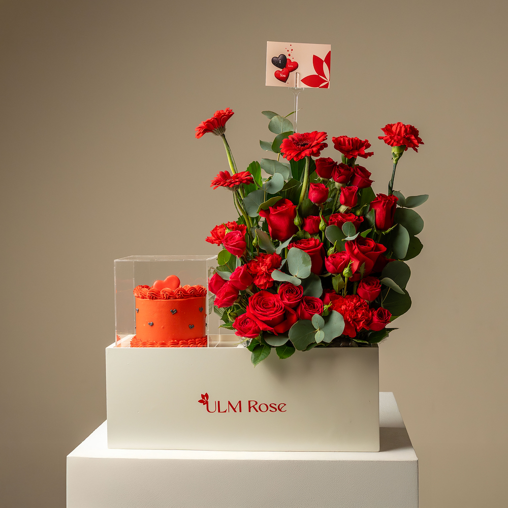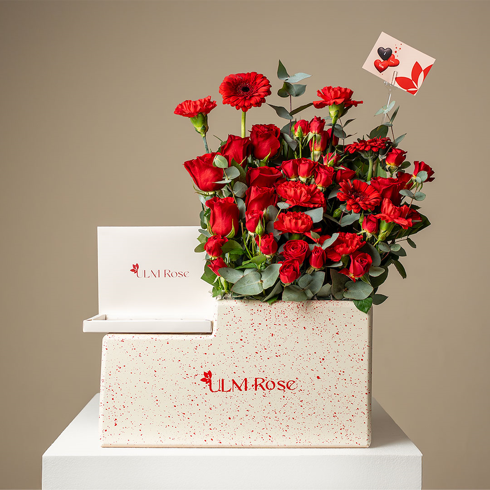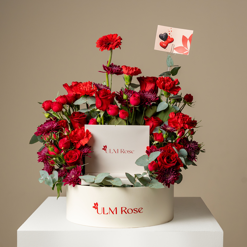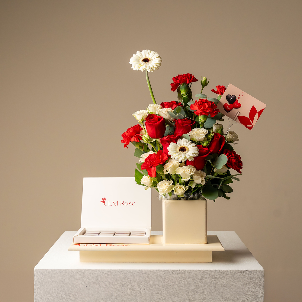 This bouquet contains Casablanca flowers, baby roses, baby orchids, hydrangeas and Belgian chocolate.