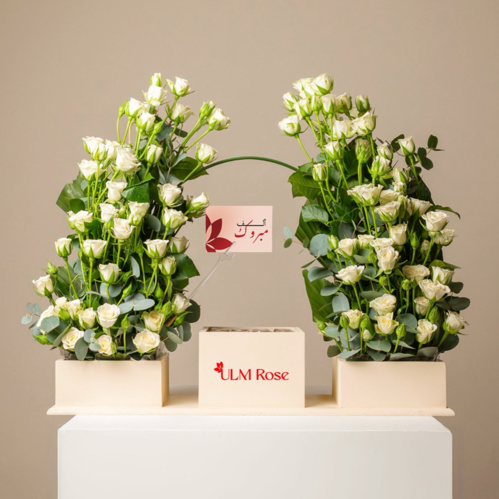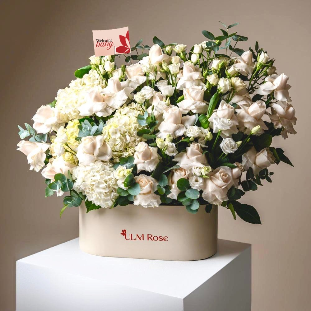 A bouquet containing roses, baby roses, hydrangeas and eucalyptus leaves, beautifully arranged in a box.