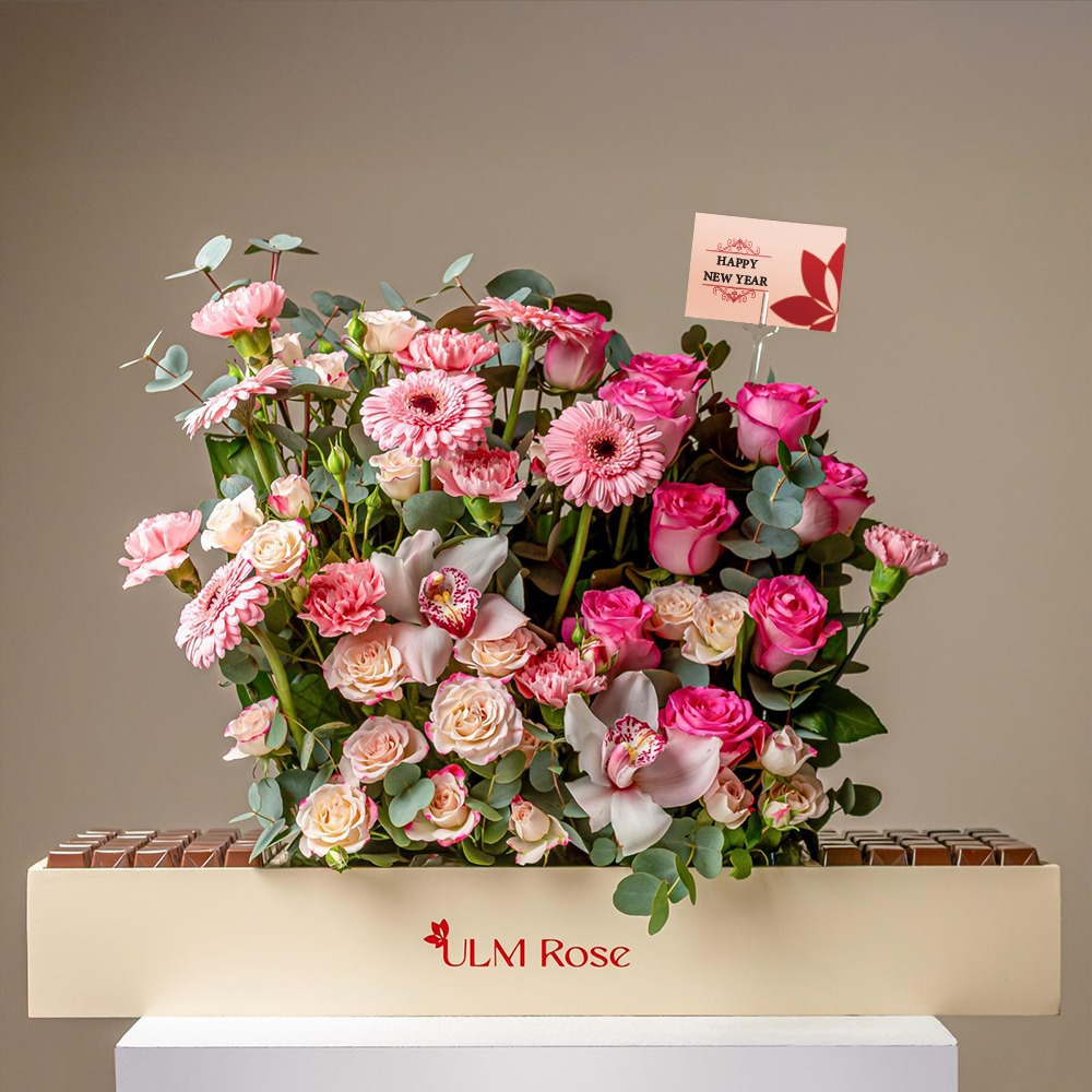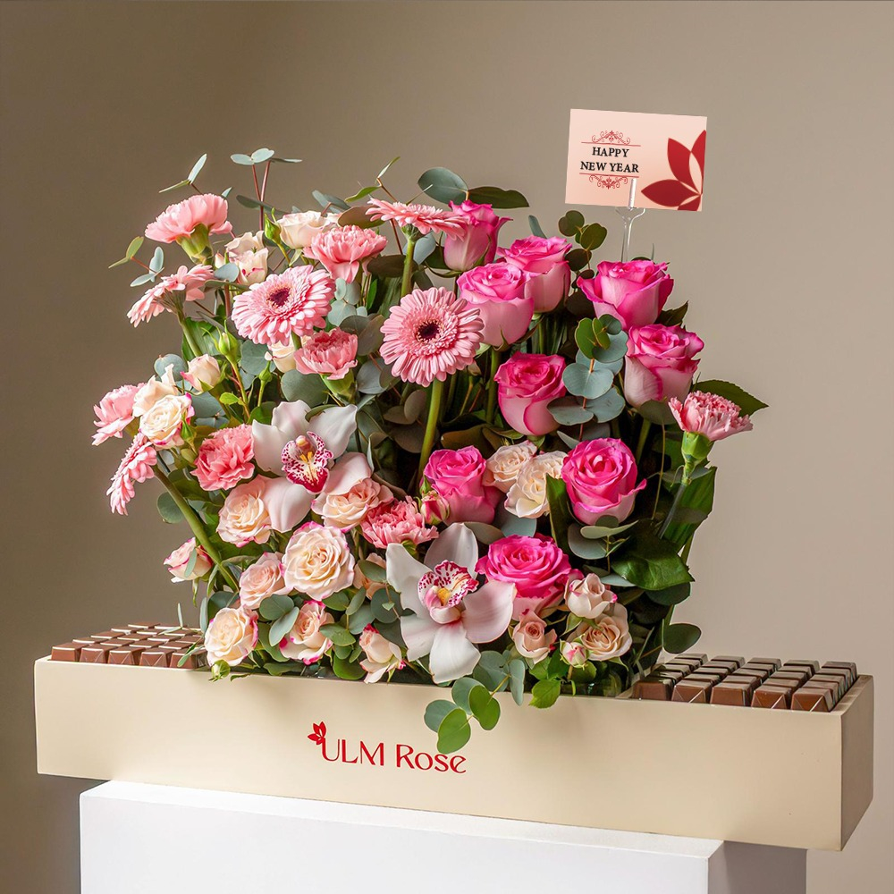 A box that contains roses, baby roses, gerberas and orchids along with Belgian chocolates.