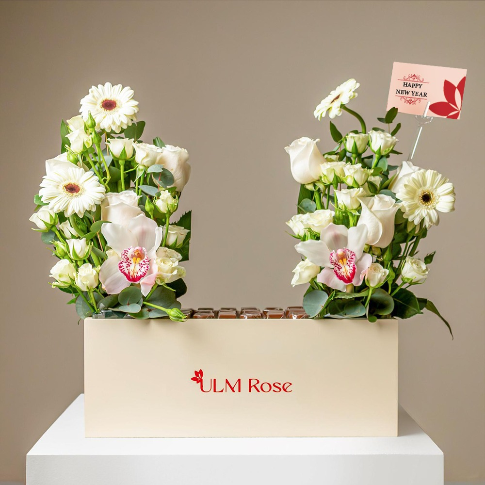 A box arranged with roses, gerberas and cymbidiums with Belgian chocolates.