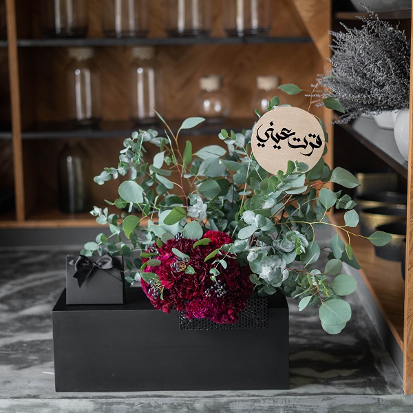 This arrangement contains carnation flowers with eucalyptus leaves and chocolates in a bag.
