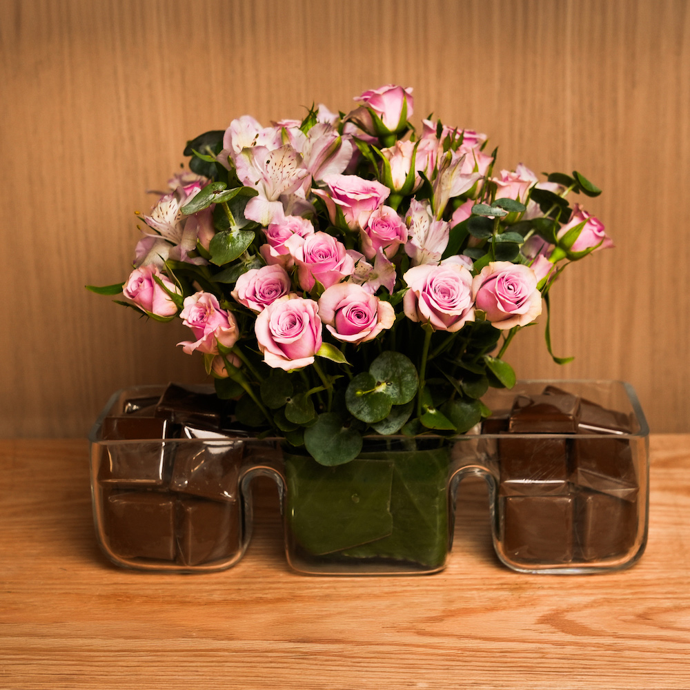 A bouquet containing roses and alstroemerias, arranged beautifully in a vase with 0.5 kg of hazelnut cream chocolates.