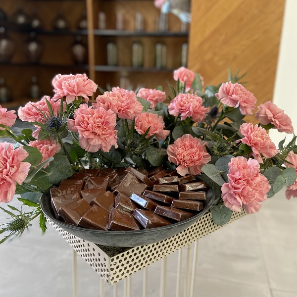 Steel vase with Carnation flowers and Belgian chocolates