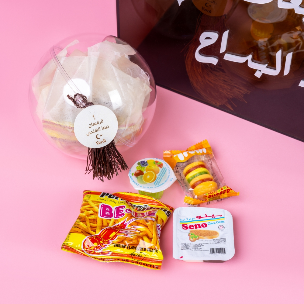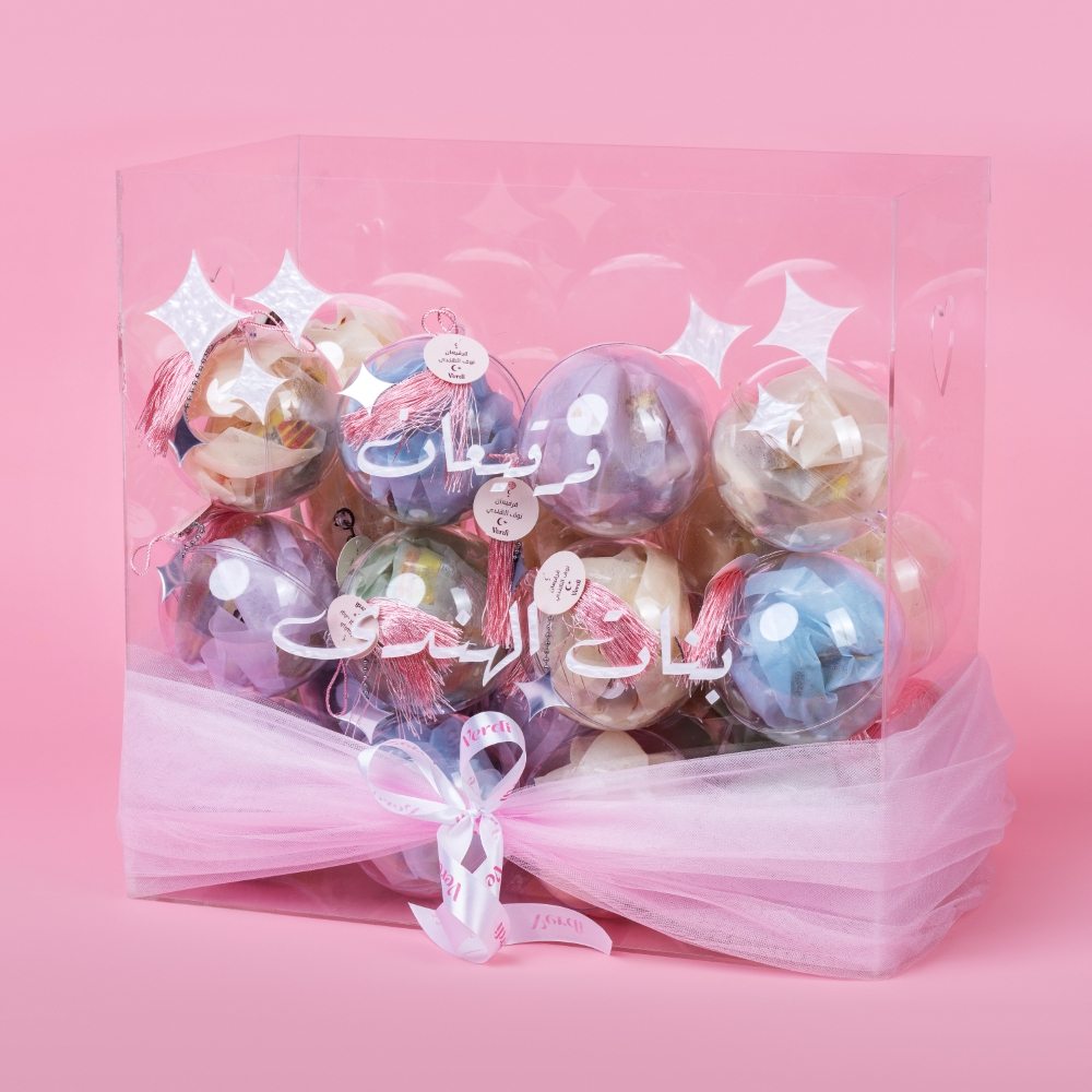 An elegant giveaway box bouquet, featuring 12 clear acrylic spheres filled with bebe snacks, seno choco cream, gummy miniburgers, and fruit jelly cups, finished with elegant tassels and custom tags, for a stylish nostalgic way to celebrate Gergean.