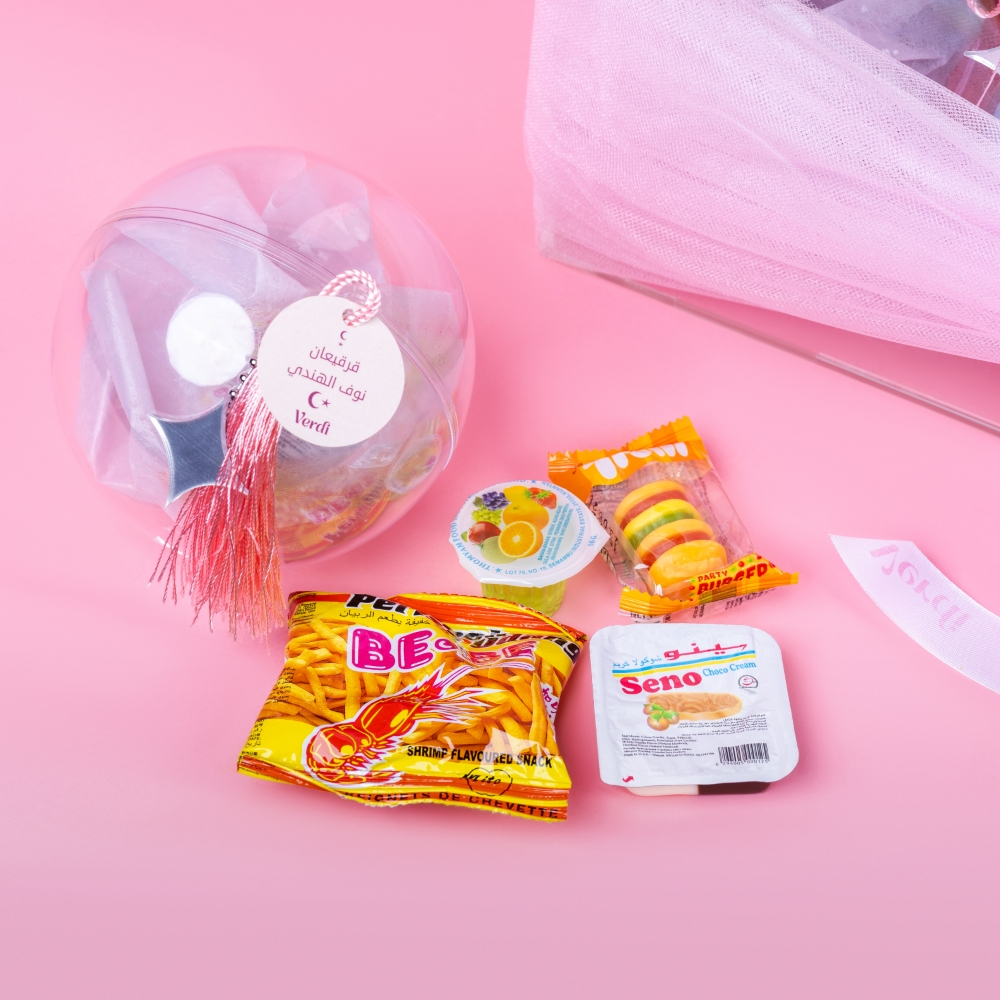 An elegant giveaway box bouquet, featuring 25 acrylic spheres filled with bebe snacks, seno choco cream, gummy miniburgers, and fruit jelly cups, finished with elegant tassels and custom tags, blending modern aesthetics with classic Gergean joy.