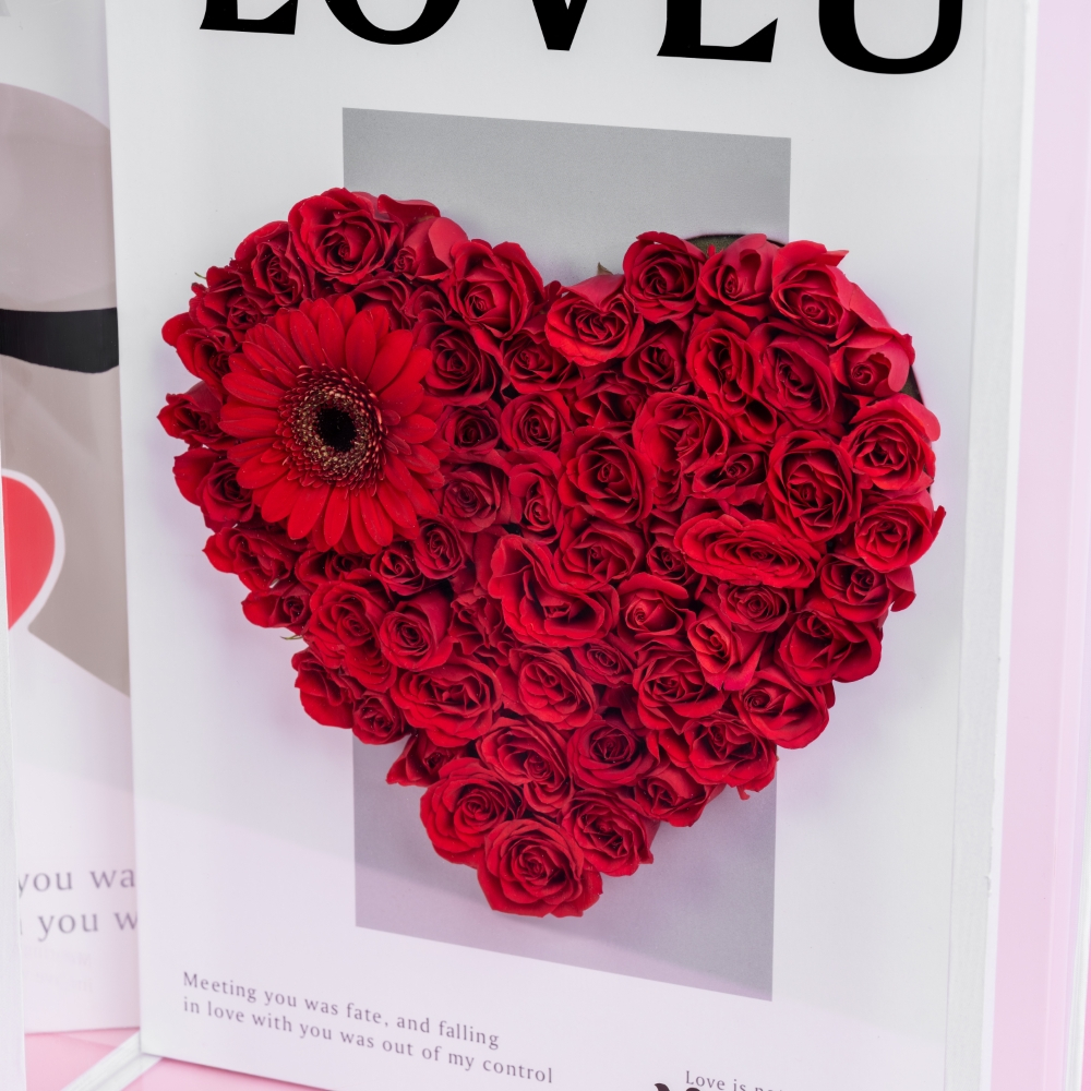 A stylish acrylic box featuring roses and gerberas, beautifully shaped into a heart. A creative and joyful gift to express your feelings with a splash of color.