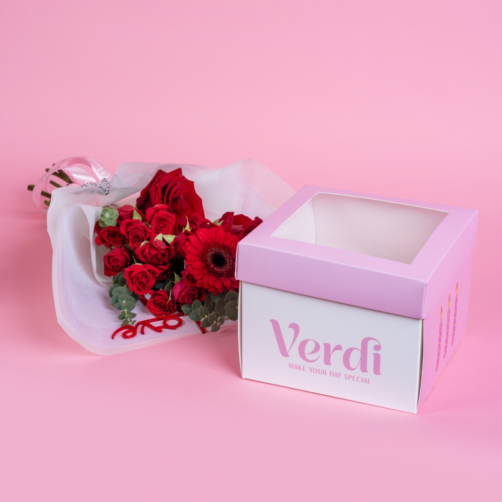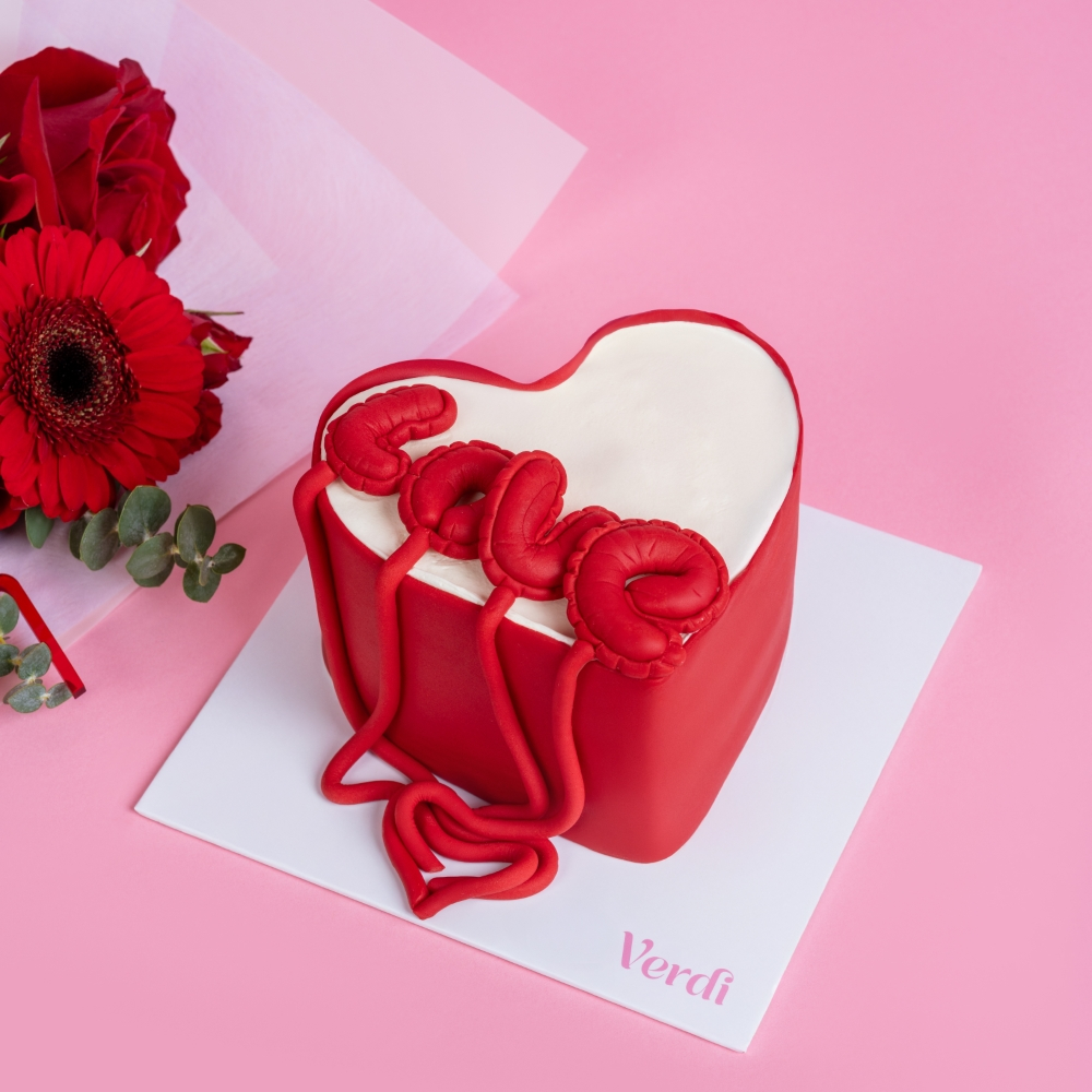 A cheerful bouquet of roses, baby roses, and gerberas, accompanied by a delicious heart-shaped cake and a Love Day topper. A fun and festive way to celebrate love and sweet moments together.